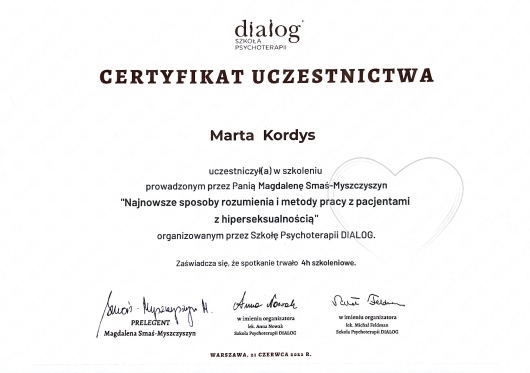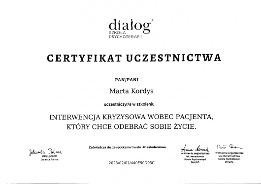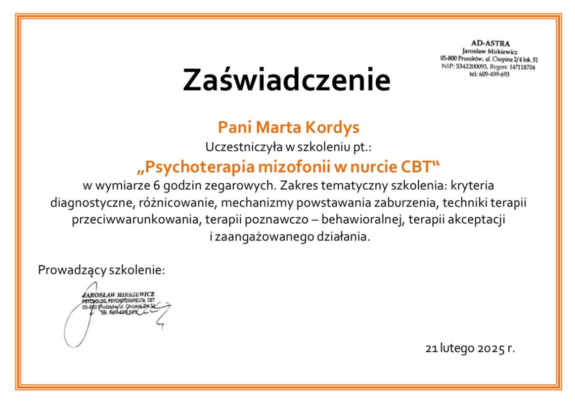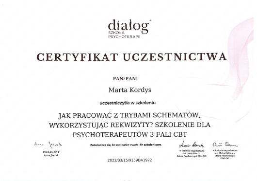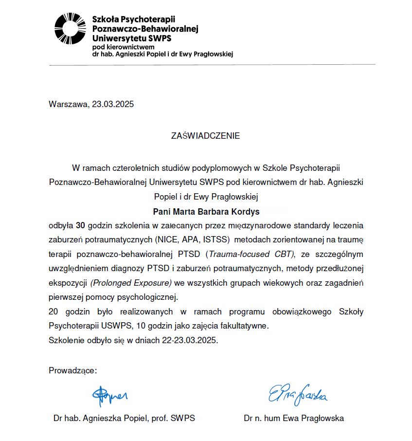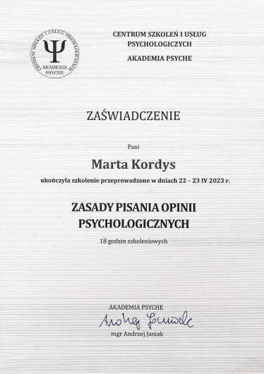 Stale aktualizuję swoją wiedzę i podnoszę kwalifikacje poprzez udział w licznych kursach i szkoleniach, a swoją pracę wykonuję zgodnie z Kodeksem Zawodu Psychologa. Jestem członkiem Polskiego Towarzystwa Terapii Poznawczej i Behawioralnej.
