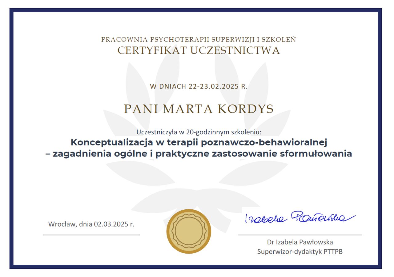 Pani Marta tworzy atmosferę pełną empatii i bezpieczeństwa, co sprawia, że mogę mówić o swoich trudnościach bez lęku przed oceną. Sesje są konkretne, merytoryczne, ale też pełne ciepła. Widzę realną poprawę w swoim codziennym funkcjonowaniu, lepiej radzę sobie ze stresem i zaczynam odzyskiwać wewnętrzny spokój. Z czystym sumieniem polecam!