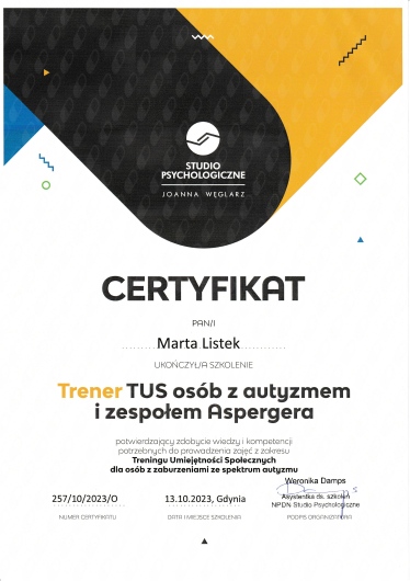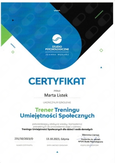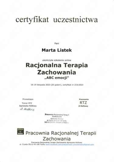 Pani Marta Listek dba o komfortową atmosferę, jest cierpliwa oraz okazuje duże zrozumienie. Jestem bardzo zadowolona z przebiegu terapii. Serdecznie polecam :)
