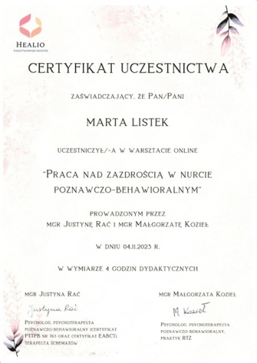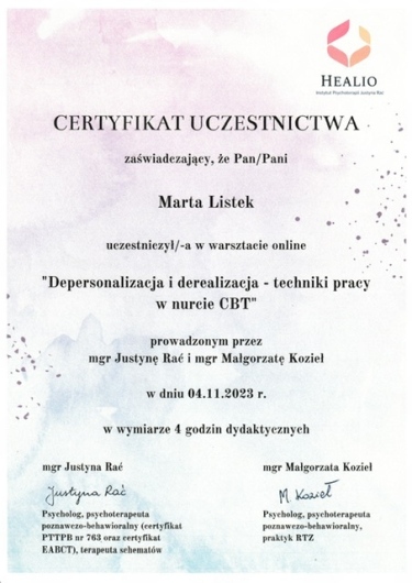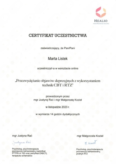 Stale podnoszę swoje kwalifikacje, uczestnicząc w szkoleniach, wykładach i konferencjach naukowych. Jestem członkiem Polskiego Towarzystwa Terapii Poznawczej i Behawioralnej. Pracuję zgodnie z Kodeksem Etycznym Psychologa, zachowuję pełną tajemnicę zawodową, a swoją pracę poddaję regularnej superwizji indywidualnej i grupowej.