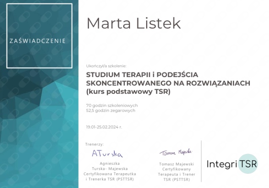 Jestem psychologiem ze specjalnością kliniczno-sądową, terapeutką Racjonalnej Terapii Zachowania (RTZ) oraz Trenerem Umiejętności Społecznych (TUS). Obecnie kontynuuję 4-letnie szkolenie psychoterapeutyczne w nurcie poznawczo-behawioralnym w Krakowskim Centrum Ter-Cognitiva, akredytowanym przez Polskie Towarzystwo Terapii Poznawczej i Behawioralnej (PTTPiB). Ukończyłam także studia podyplomowe z przygotowania pedagogicznego oraz szkolenie w zakresie Terapii Skoncentrowanej na Rozwiązaniach (TSR).