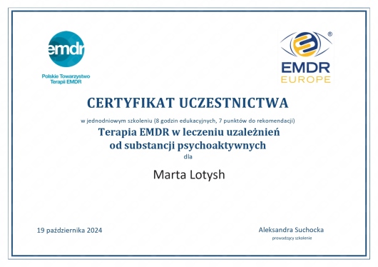 Ukończyłam psychologię (stopień magistra) oraz psychologię społeczną (studia doktoranckie) na Lwowskim Narodowym Uniwersytecie, psychotraumatologię (studia podyplomowe) na WSB NLU w Nowym Sączu, obecnie studiuję psychoterapię w 4-letniej szkole CBT na WSB NLU w Nowym Sączu. Ukończyłam także certyfikowany kurs terapii EMDR organizowany przez Polskie Towarzystwo Terapii EMDR. Regularnie uczestniczę w specjalistycznych szkoleniach organizowanych przez Polskie Towarzystwo Terapii EMDR.