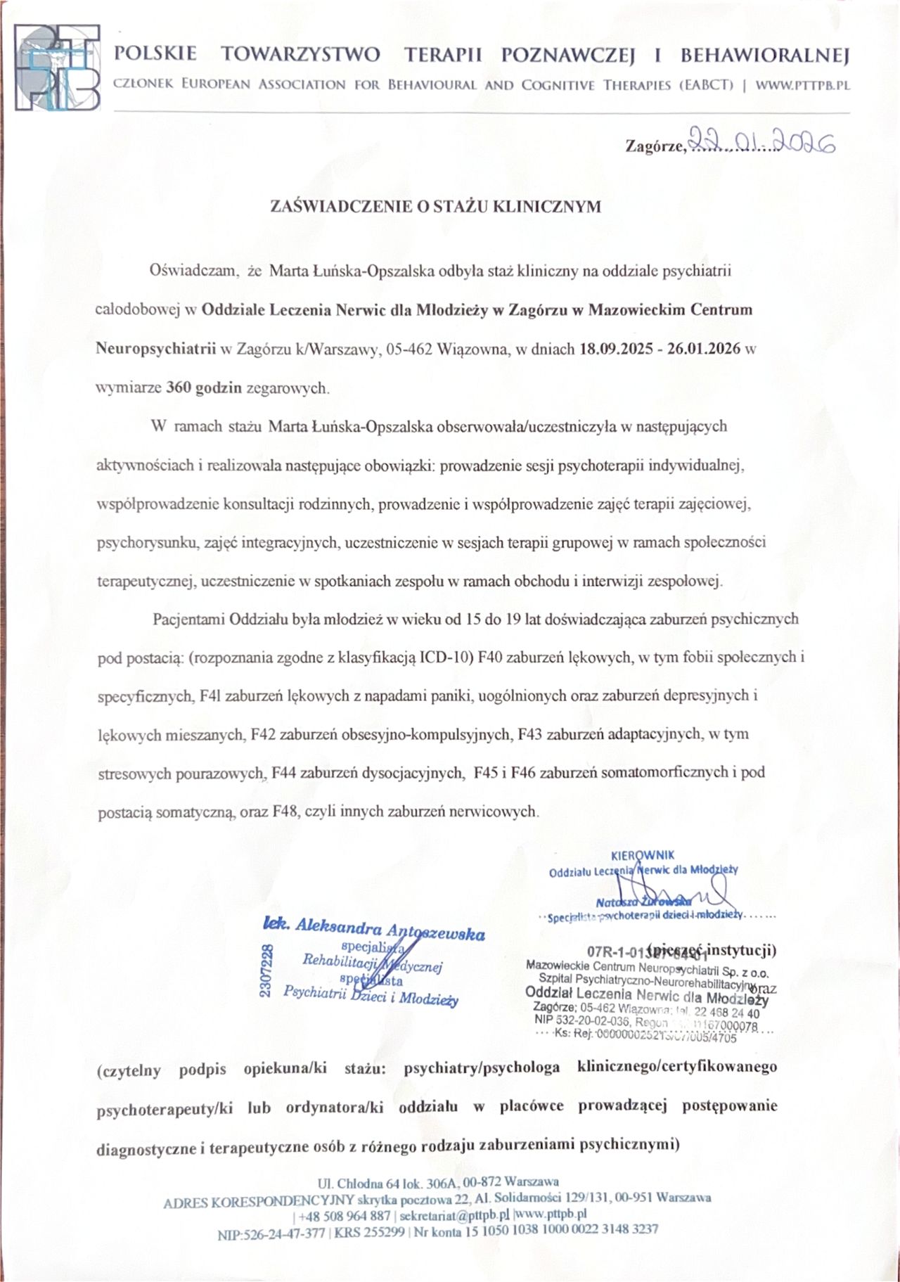 Staż kliniczny odbywałam w Akademickim Ośrodku Psychoterapii w Warszawie oraz na Oddziale Leczenia Nerwic dla Młodzieży w Zagórzu.