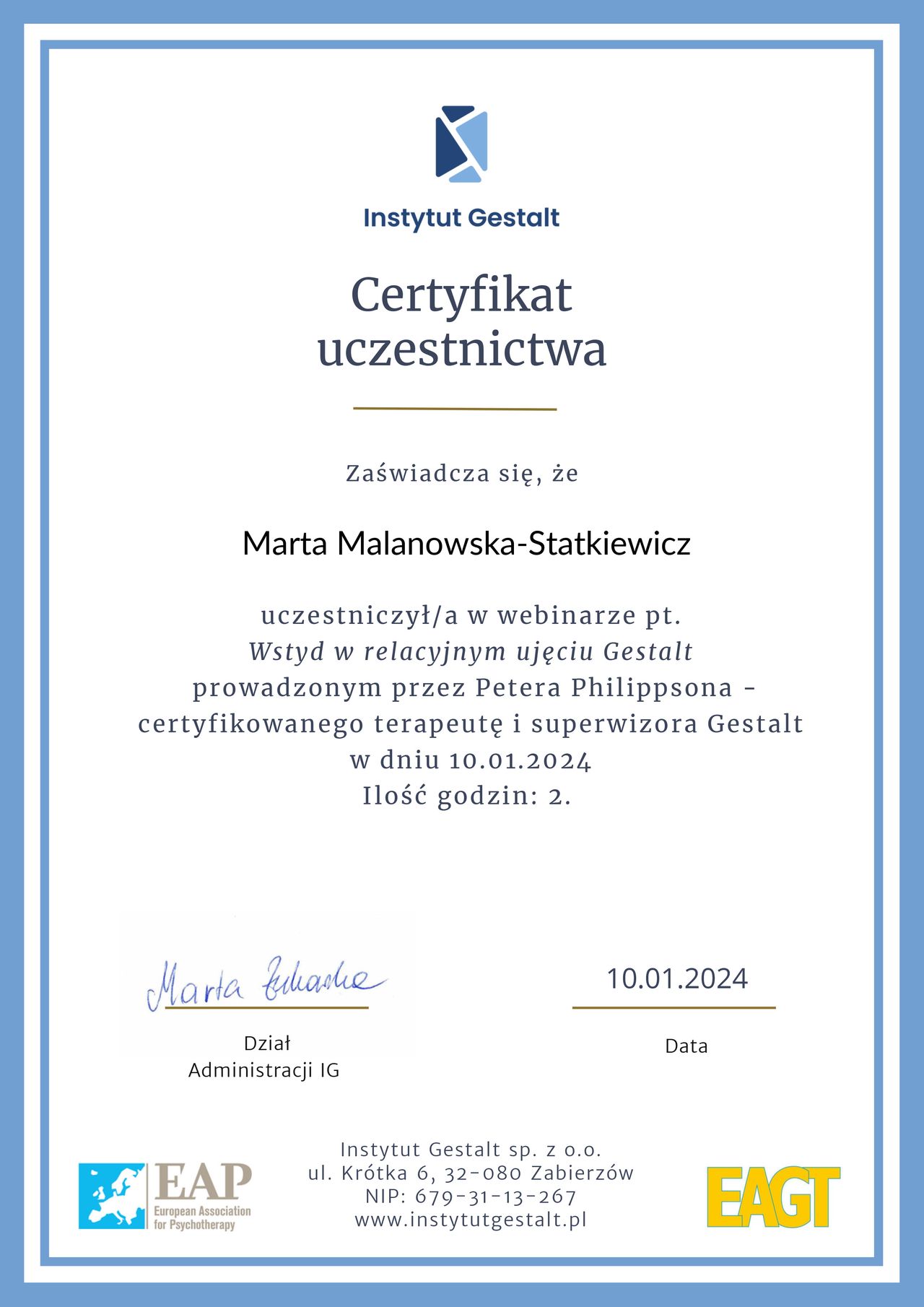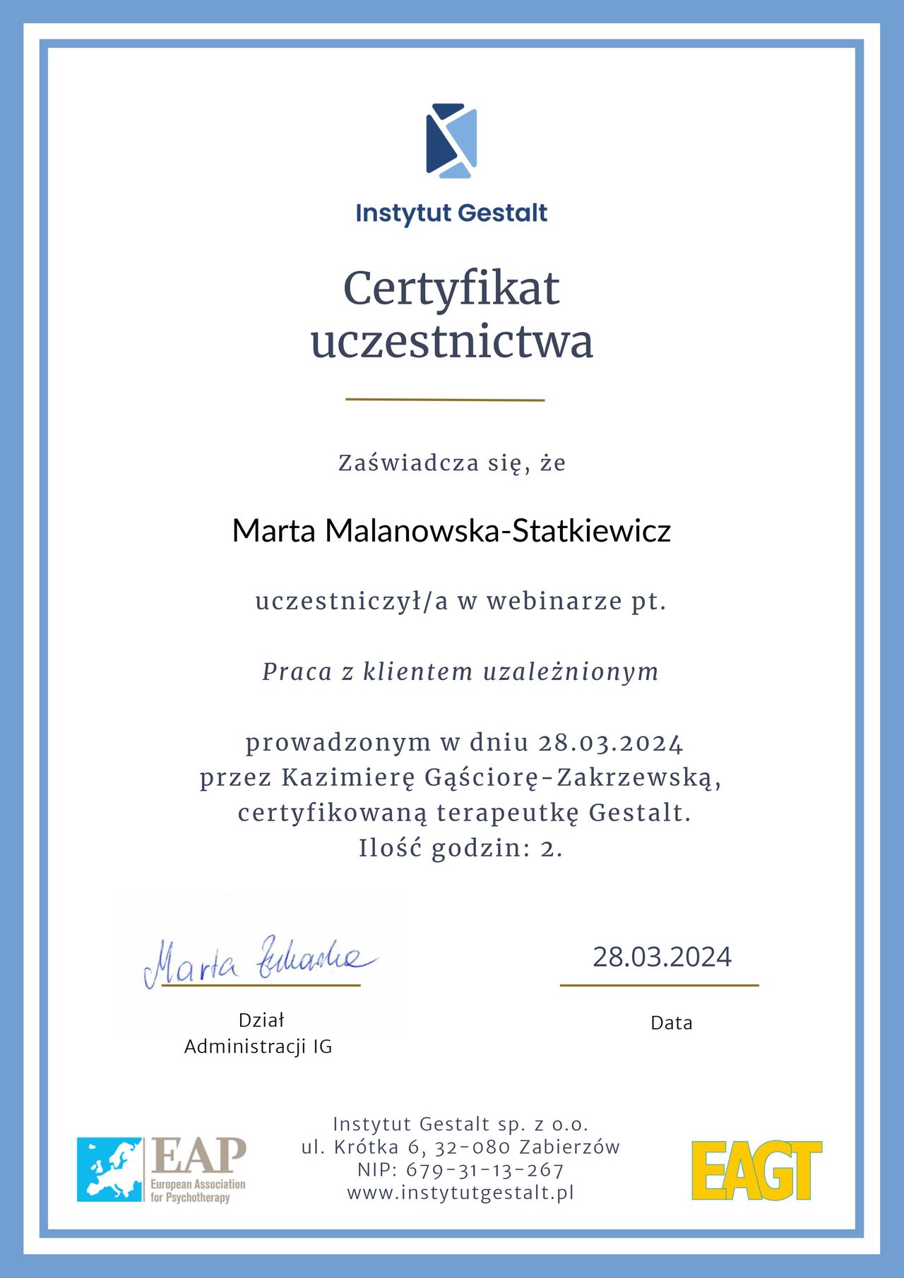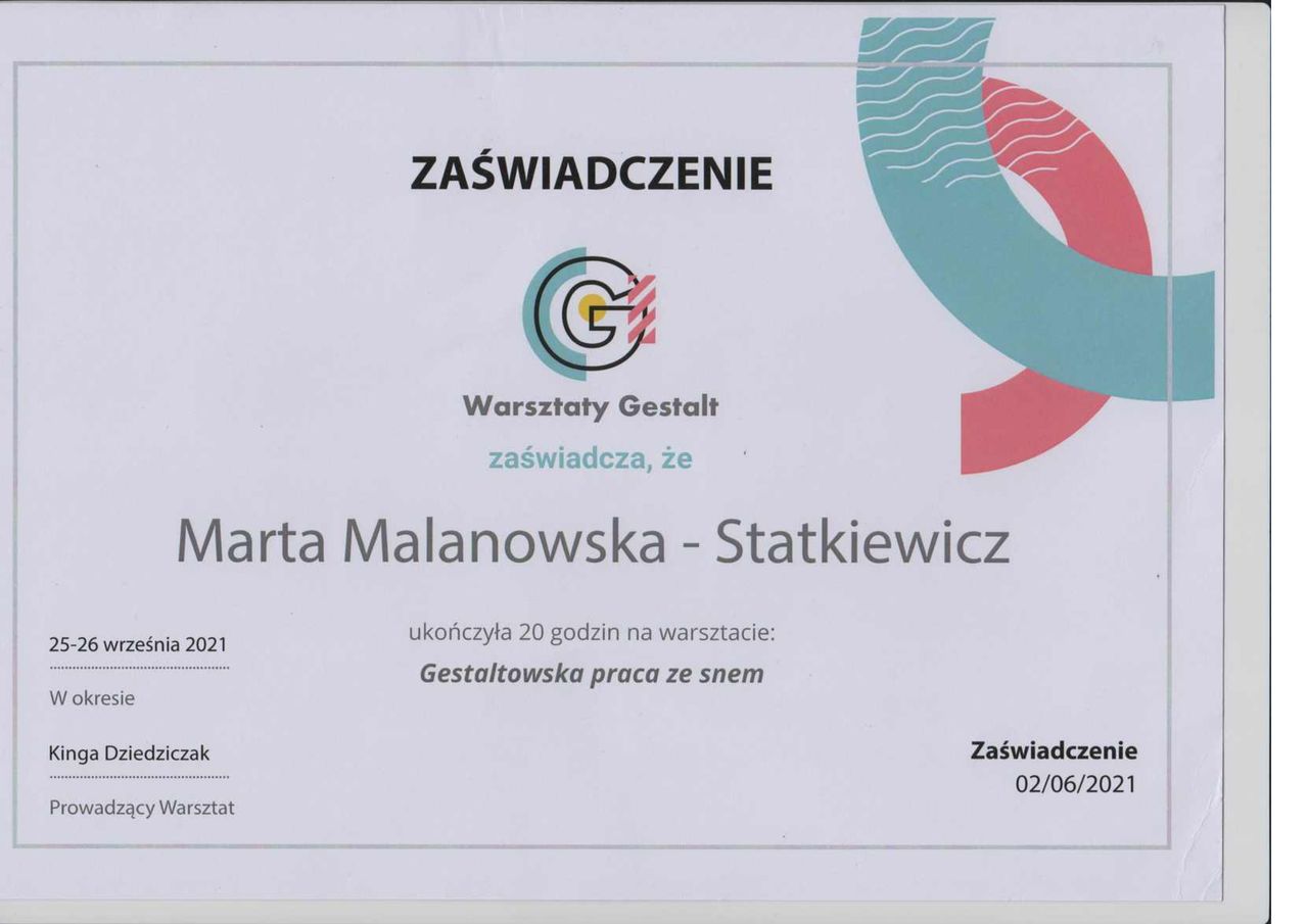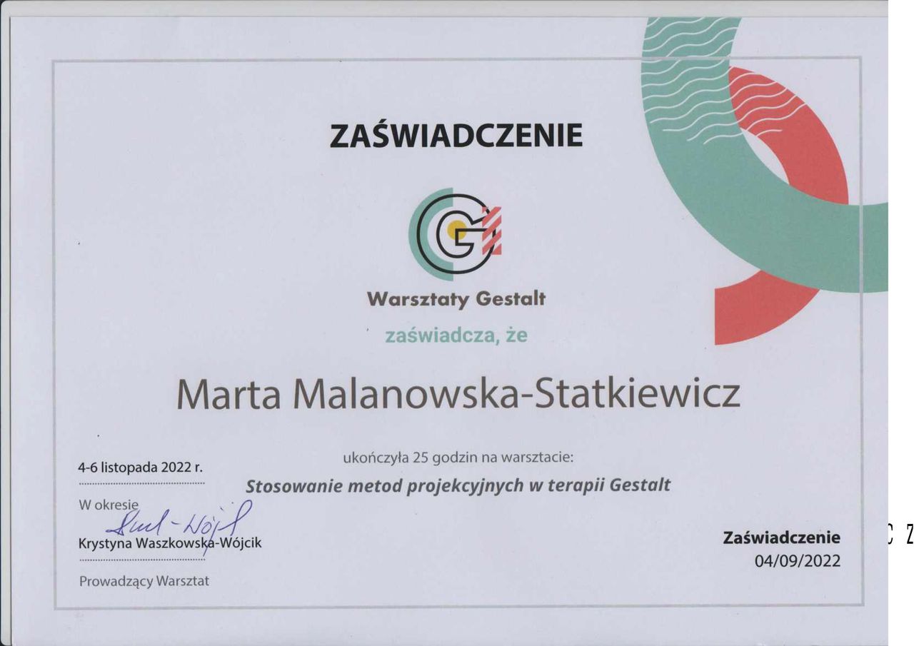 Jestem psychoterapeutką Gestalt w procesie certyfikacji. Ukończyłam szkołę psychoterapii Gestalt w Warszawie.