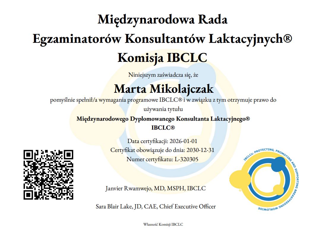 Ukończyłam studia magisterskie na kierunku położnictwo na Uniwersytecie Jagiellońskim Collegium Medicum w Krakowie. Jestem Międzynarodowym Dyplomowanym Konsultantem Laktacyjnym IBCLC oraz Promotorką Dobrego Startu Dziecka.