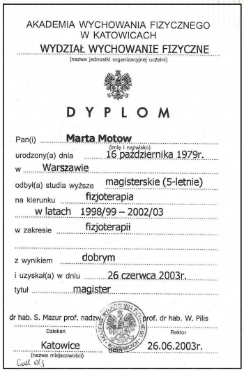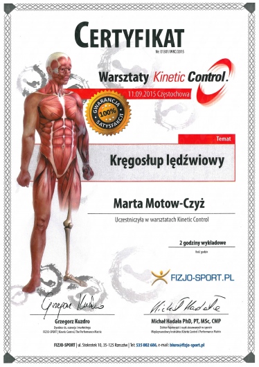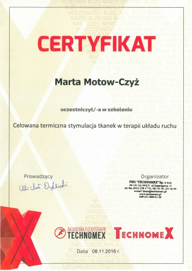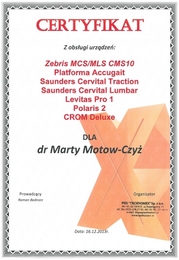 Jaki jest zakres porad oferowanych przez Marta Motow-Czyż?Marta Motow-Czyż to fizjoterapeuta. Na podstawie swojego doświadczenia i wykształcenia Marta Motow-Czyż oferuje usługi takie jak: rehabilitacja neurologiczna, Masaż leczniczy, taping (plastrowanie), ćwiczenia korekcyjne, Laseroterapia, ultradźwięki, prądy TENS, jonoforeza, magnetoterapia, elektrostymulacja.