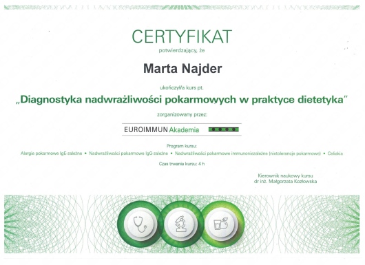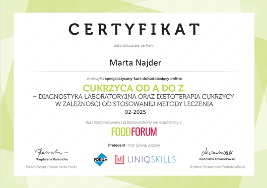 Pierwsza wizyta u Pani Marty była bardzo pozytywnym doświadczeniem. Profesjonalne podejście, szczegółowy wywiad i konkretne wskazówki sprawiły, że czuję się zmotywowana do wprowadzenia zmian. Wszystko zostało dokładnie wyjaśnione, a plan żywieniowy jest dostosowany do moich potrzeb. Zdecydowanie polecam!