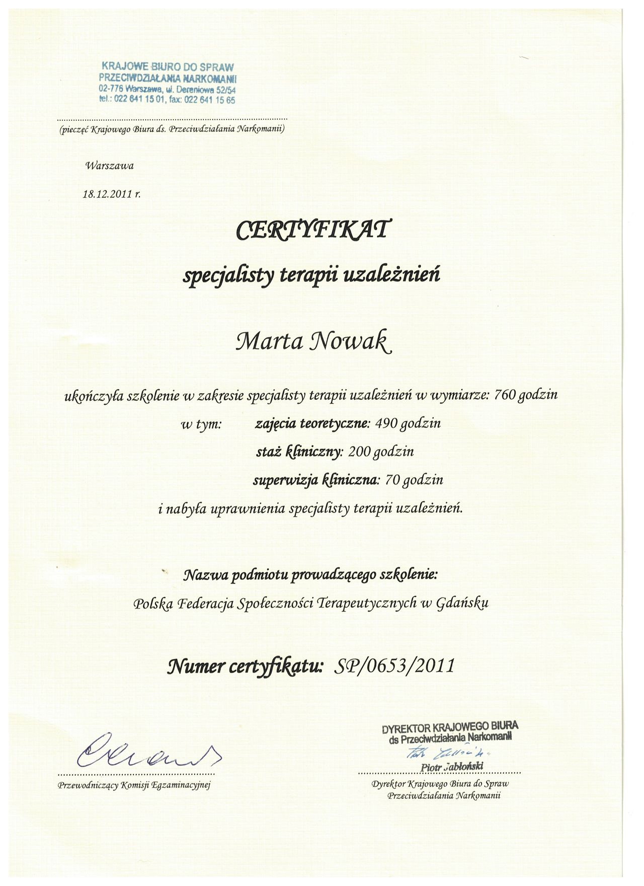 Jestem Specjalistą Psychoterapii Uzależnień, a sam Certyfikat uzyskałem pod akredytacją Krajowego Biura Do Spraw Przeciwdziałania Narkomanii (dzisiejsze: Krajowe Centrum Przeciwdziałania Uzależnieniom), kończąc 4 letnie szkolenie w Gdańsku.