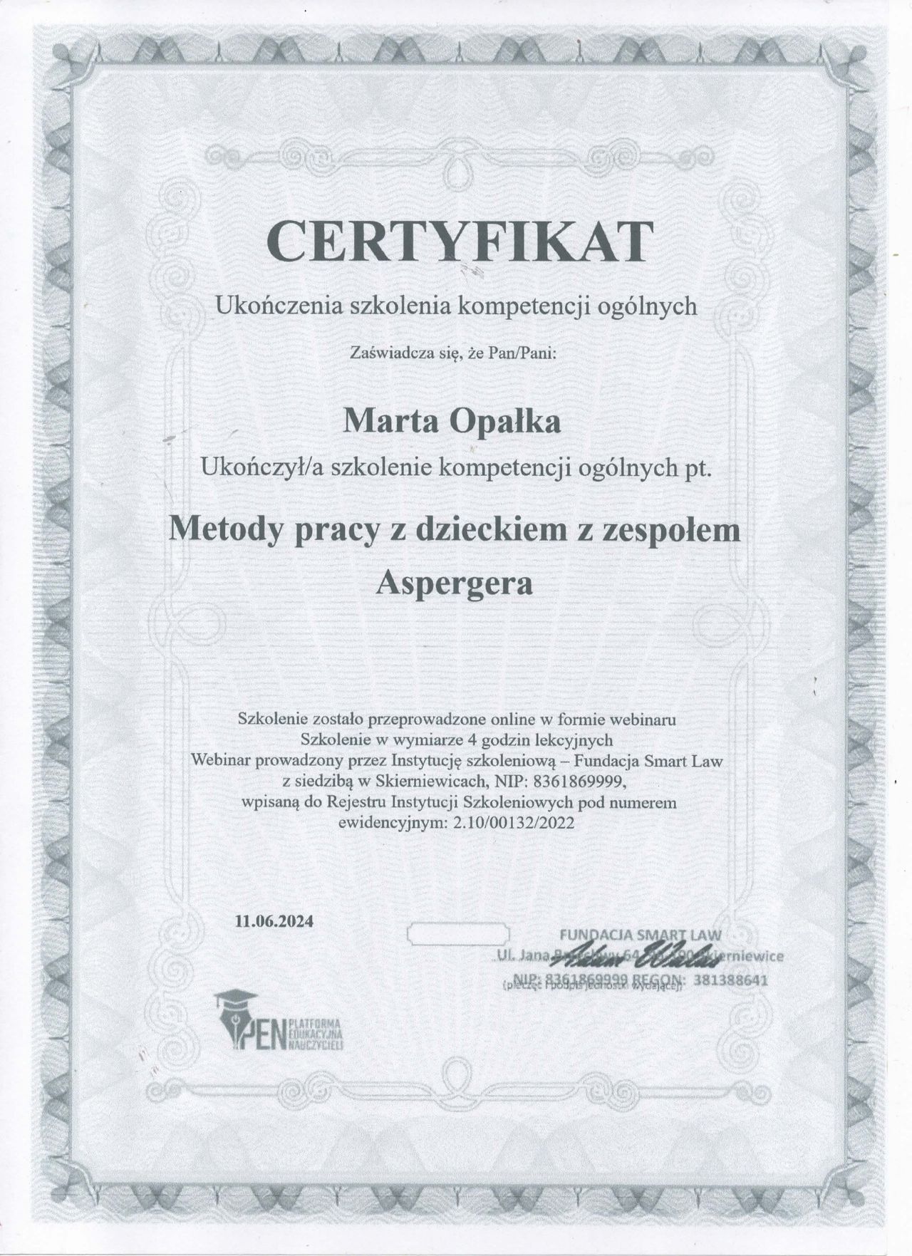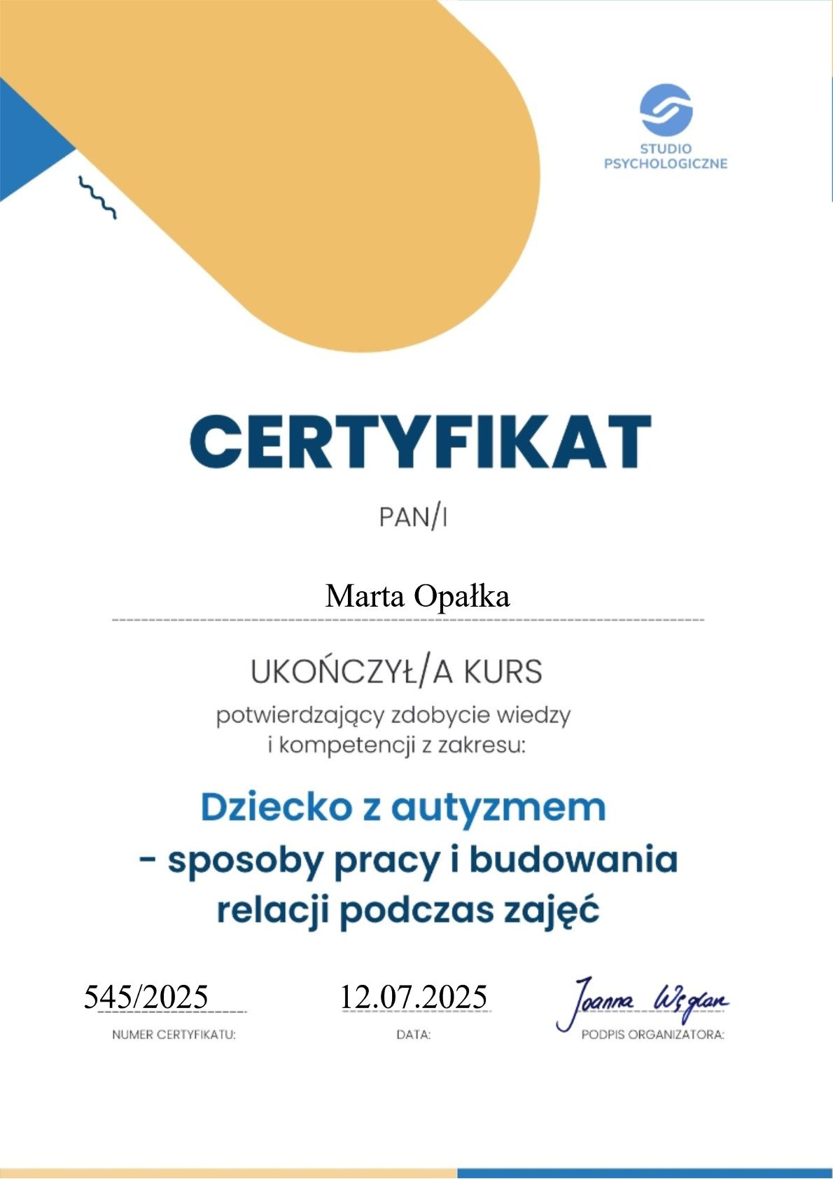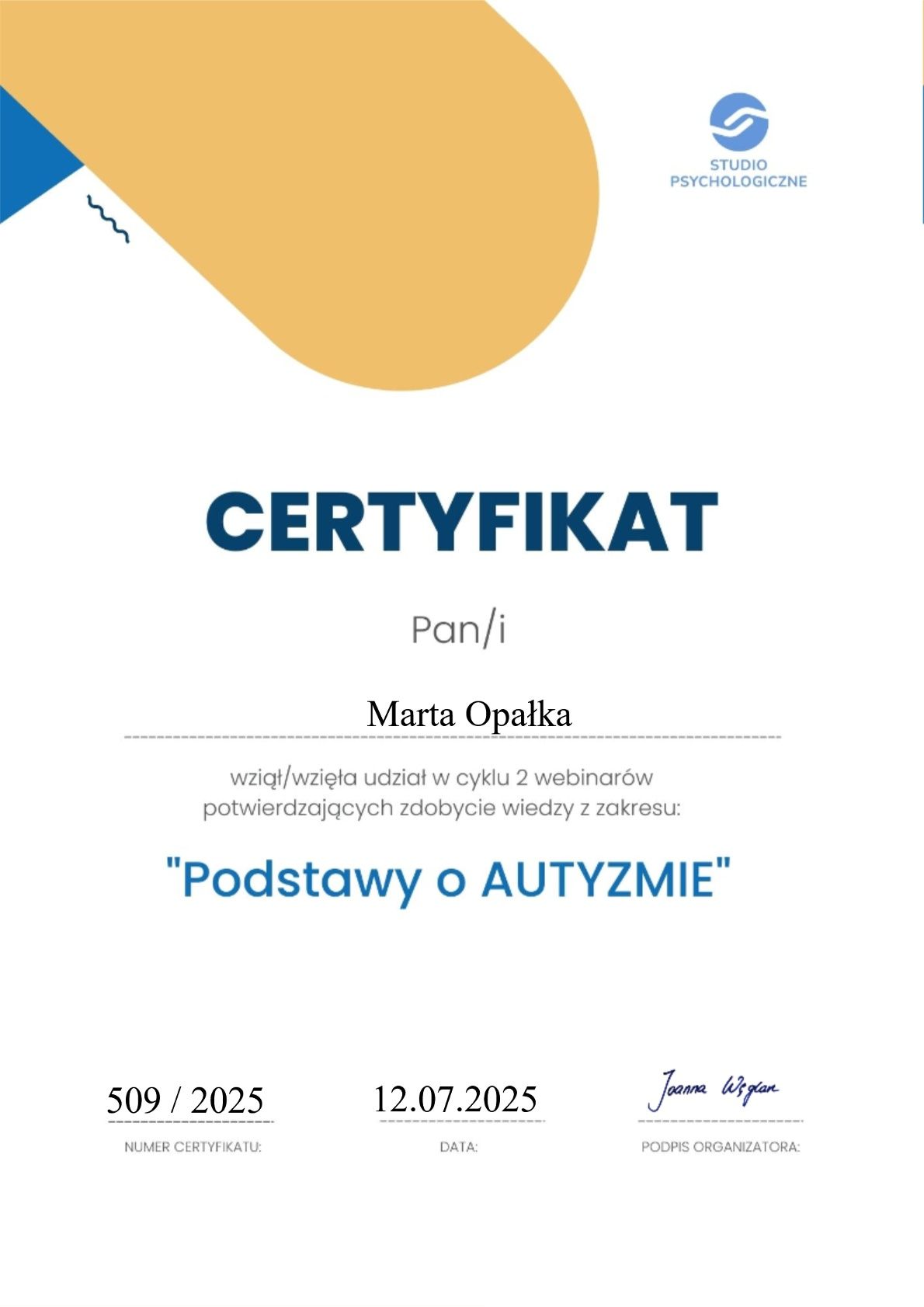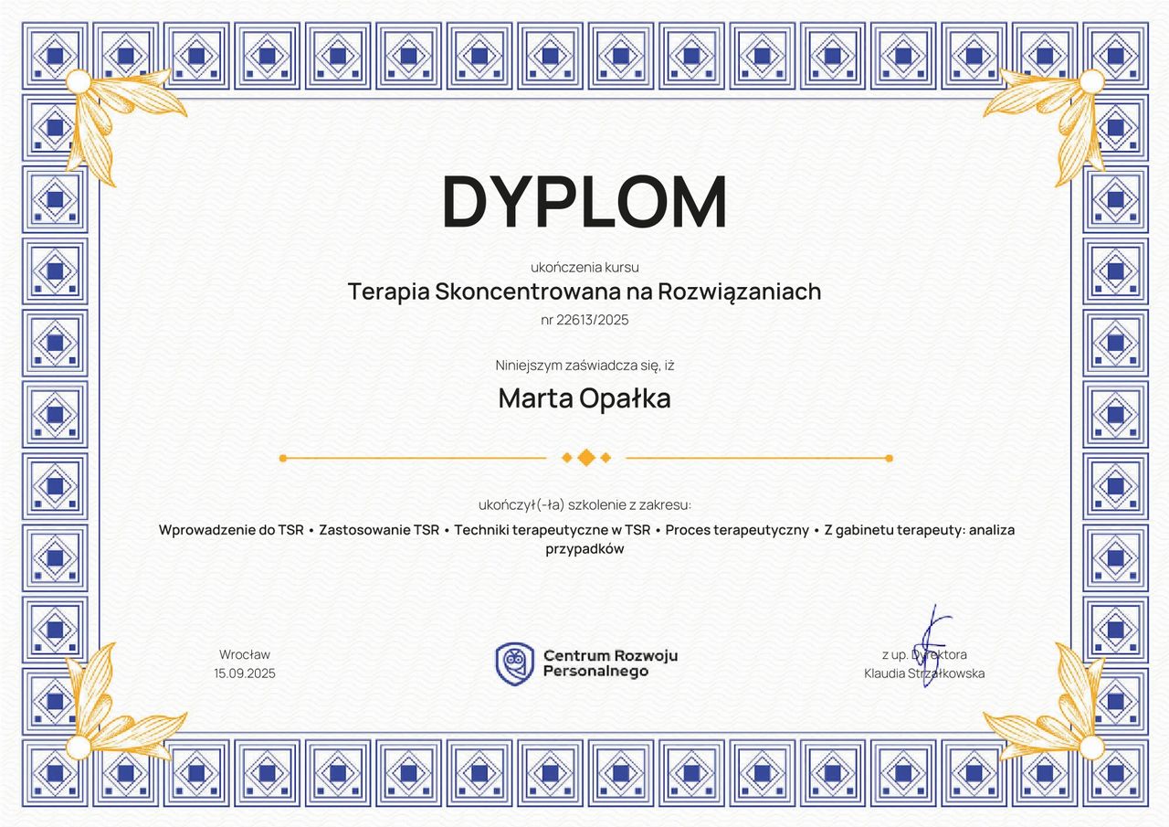 Jestem psychologiem, absolwentką studiów z zakresu psychologii klinicznej i zdrowia na Uniwersytecie Dolnośląskim DSW. Ukończyłam kurs interwencji kryzysowej oraz szkolenie z terapii skoncentrowanej na rozwiązaniu (TSR). Odbyłam również specjalistyczne szkolenia z zakresu pracy z dziećmi i z młodzieżą w obszarze ADHD oraz spektrum autyzmu,a także liczne kursy dotyczące diagnozy,terapii i wsparcia psychologicznego.Aktualnie poszerzam swoją wiedzę w trakcie studiów podyplomowych z seksuologii.