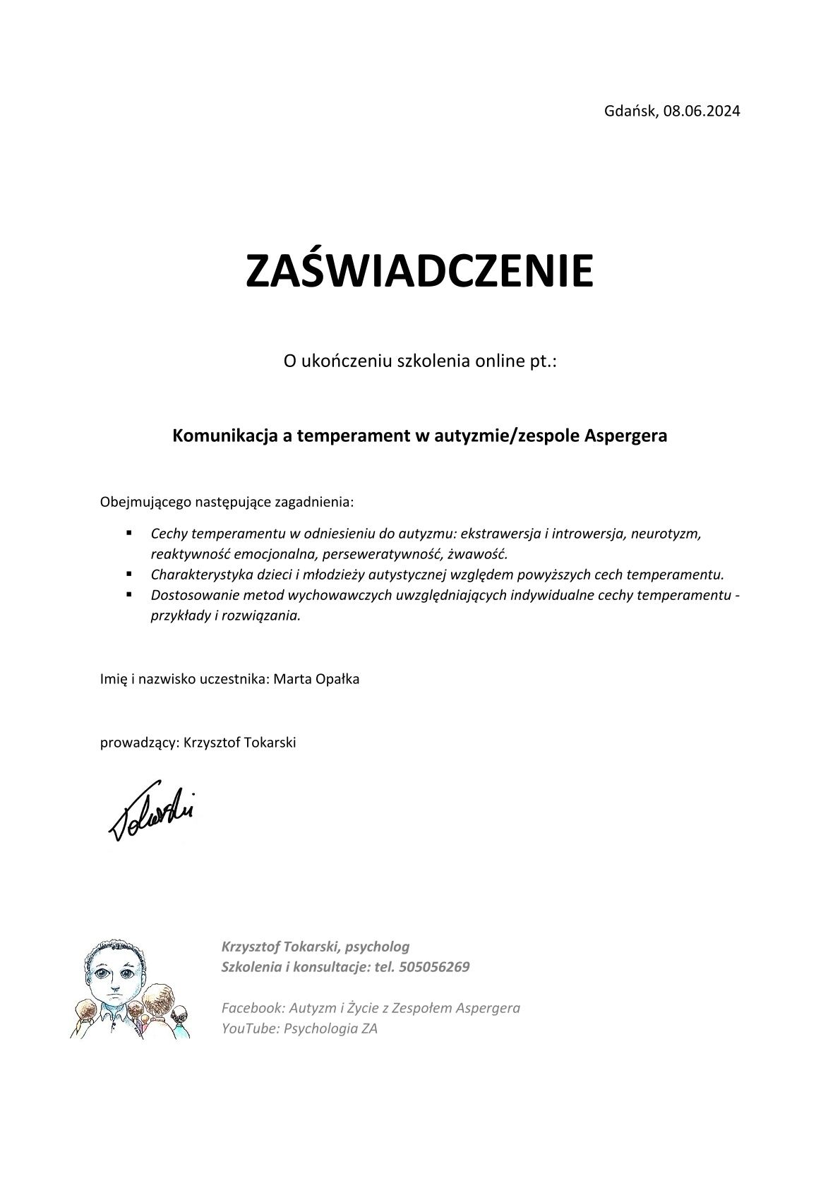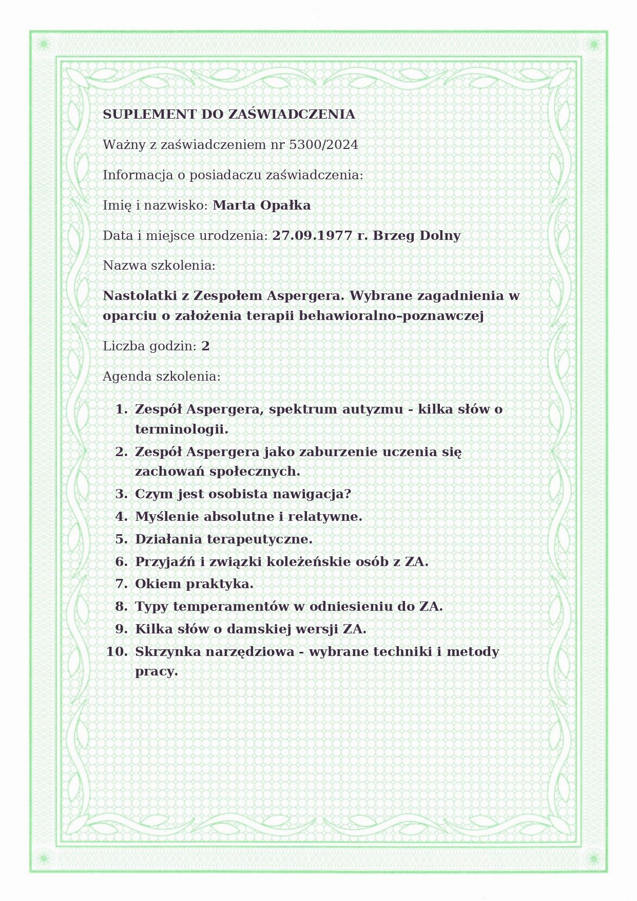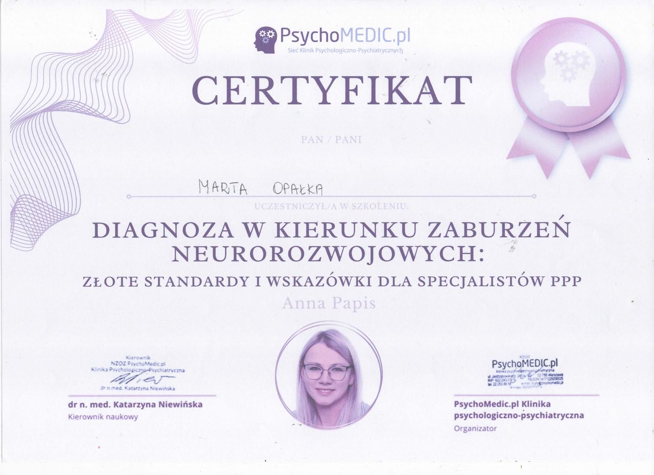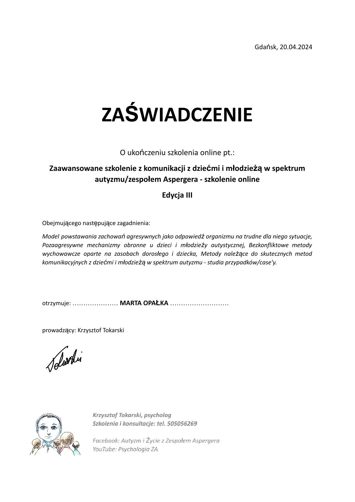 Jestem psychologiem, absolwentką studiów z zakresu psychologii klinicznej i zdrowia na Uniwersytecie Dolnośląskim DSW. Ukończyłam kurs interwencji kryzysowej oraz szkolenie z terapii skoncentrowanej na rozwiązaniu (TSR). Odbyłam również specjalistyczne szkolenia z zakresu pracy z dziećmi i z młodzieżą w obszarze ADHD oraz spektrum autyzmu,a także liczne kursy dotyczące diagnozy,terapii i wsparcia psychologicznego.Aktualnie poszerzam swoją wiedzę w trakcie studiów podyplomowych z seksuologii.