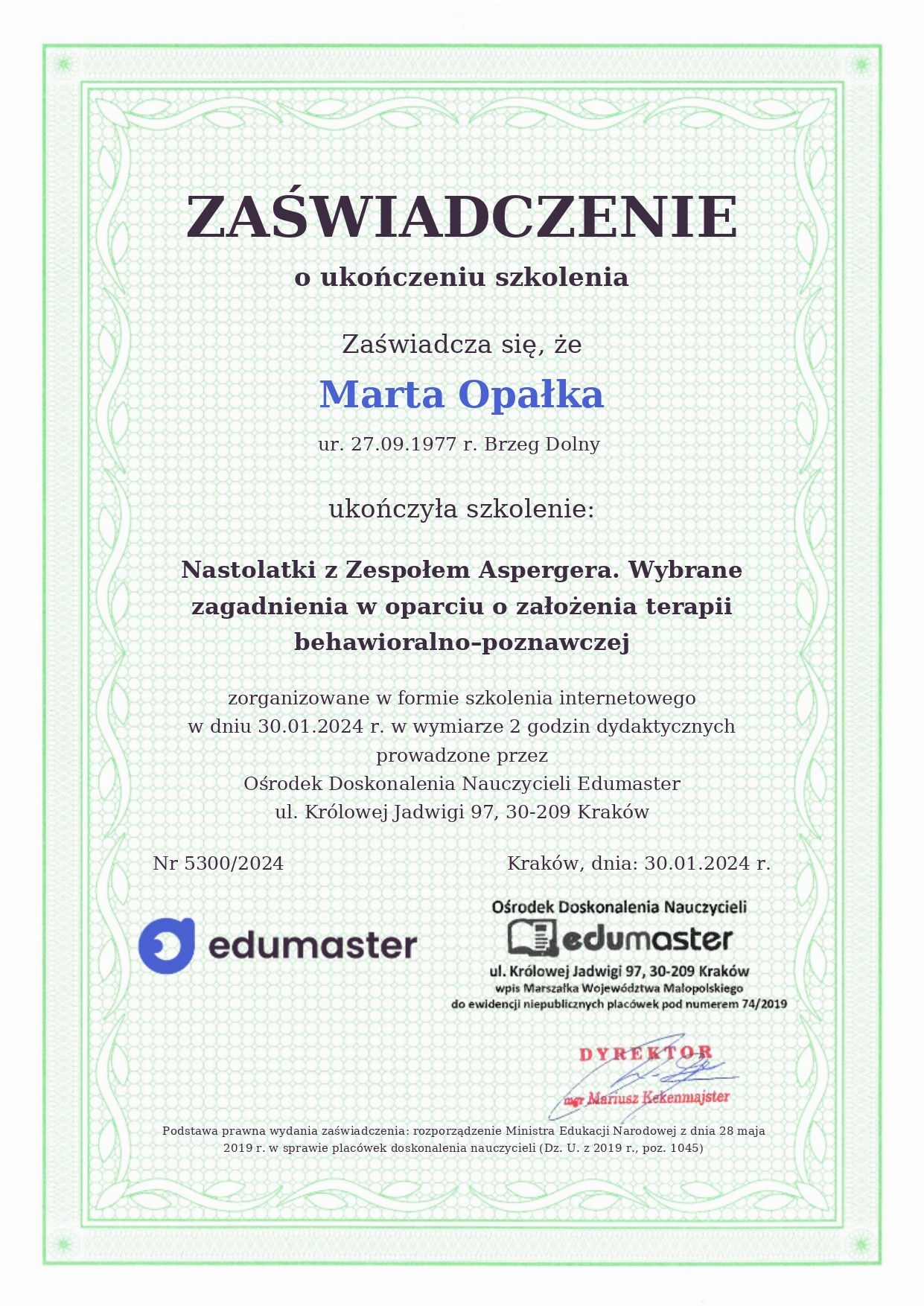 Jaki jest zakres porad oferowanych przez Marta Opałka?Marta Opałka to psycholog. Na podstawie swojego doświadczenia i wykształcenia Marta Opałka oferuje usługi takie jak: Konsultacja psychologiczna, psychoedukacja, konsultacja psychologiczna (kolejna wizyta), interwencja kryzysowa, konsultacja psychologiczna dzieci, poradnictwo dla rodziców, relaksacja, warsztaty psychologiczne, konsultacja psychologiczna (pierwsza wizyta), poradnictwo psychologiczne.