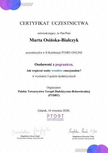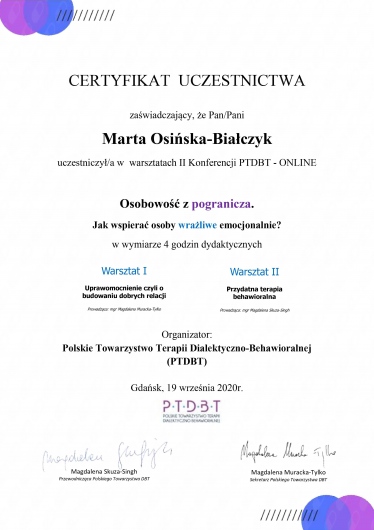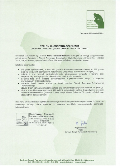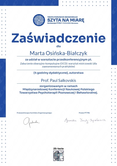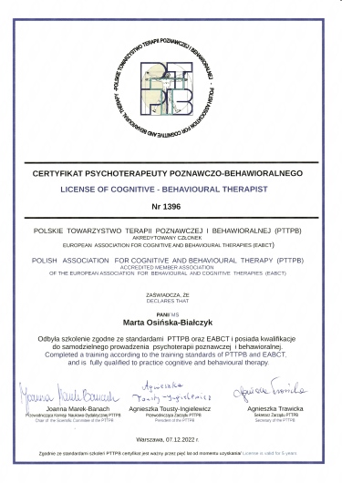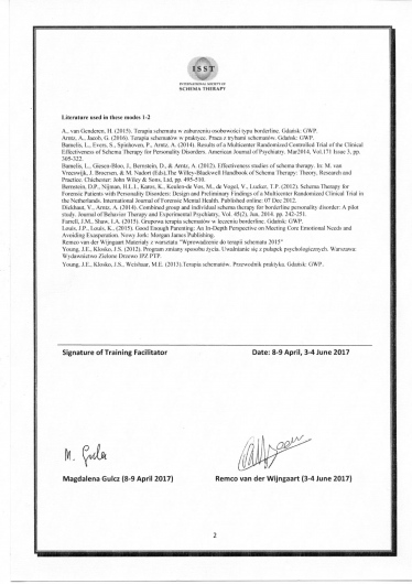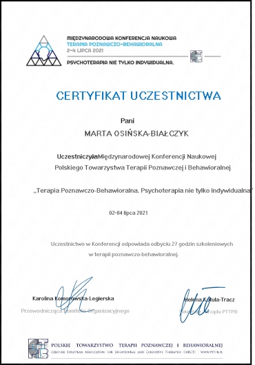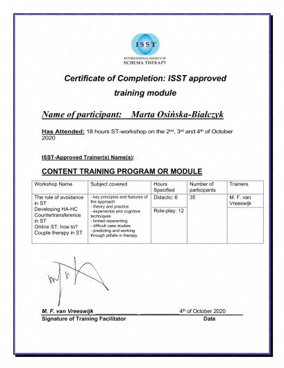 Stale się rozwijam jako członek Międzynarodowego Stowarzyszenia Terapii Schematu (ISST) oraz Polskiego Towarzystwa Terapii Poznawczej i Behawioralnej (PTTPB).