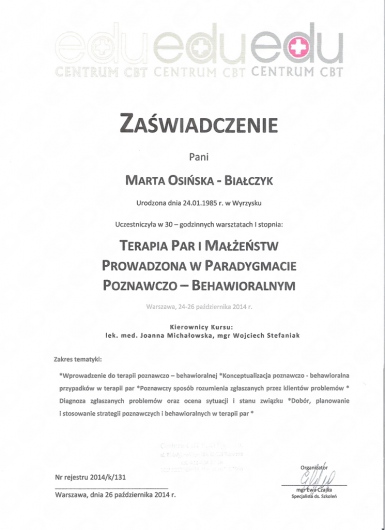 Jakiś czas byłam u Pani Marty z zaburzeniami lekowymi uogólnionymi. Owszem Pani Marta słucha i jest empatyczna. Ale nie tego się spodziewałam. Nurt poznawczo-behawioralny bazuje na badaniach i konkretnych danych. Bez żadnego testu oznajmiła,że mam zaburzenia osobowości. Wystraszyłam sie jeszcze bardziej. Skorzystałam z innego terapeuty w tym nurcie, który po przeprowadzeniu szczególowej analizy zakwestionował diagnoze. Nie polecam osobom bardzo lękowym. Pani nie pracuje na protokołach (rekomendowanych w zaburzeniach pierwszej osi). Raczej opiera terapię na rozmowie,co jest bliższe nurtowi psychoanalitycznemu.