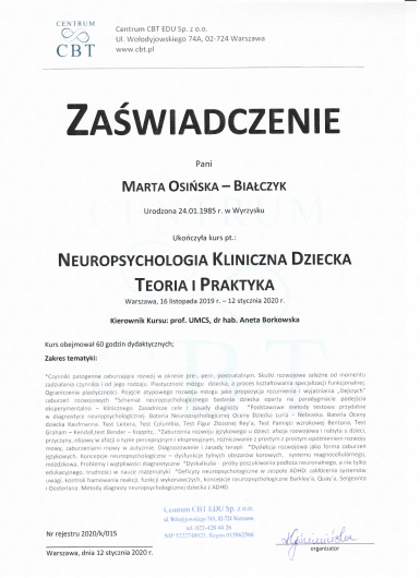 Czy Marta Osińska-Białczyk przyjmuje online, bez konieczności pojawiania się w placówce?Tak, Marta Osińska-Białczyk oferuje konsultacje online. Wybierz opcję „konsultacja online” przy umawianiu wizyty, a zobaczysz dostępne terminy.