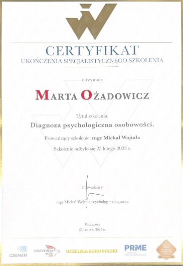 Tytuł magistra psychologii uzyskałam w 2024 roku na UBiNS "Varsovia". Tematem moich badań, jak i tytułem pracy magisterskiej były - Różnice międzypłciowe w zakresie emocji, w sytuacji podjadania. Posiadam praktykę w Szpitalu Wojewódzkim w Poznaniu w Dziale Żywienia.