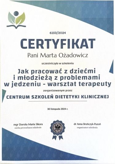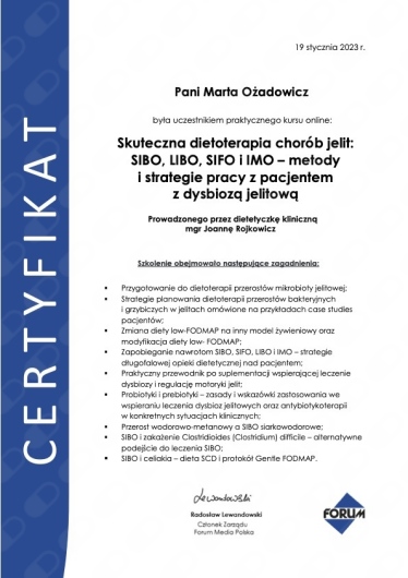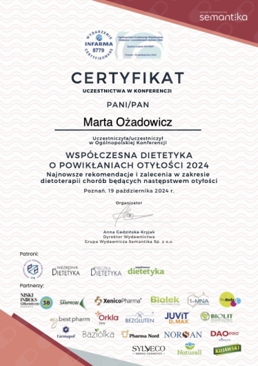 - Certyfikowany Członek Zwyczajny Polskiego Stowarzyszenia Dietetyków