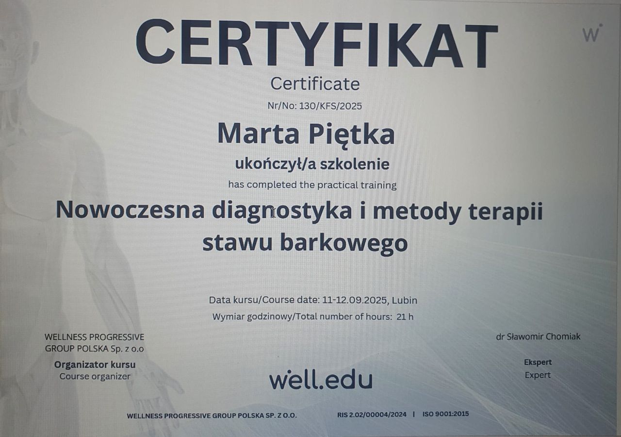 polecam serdecznie Panią Martę, słucha pacjenta, rozumie potrzeby, dobiera odpowiednie ćwiczenia