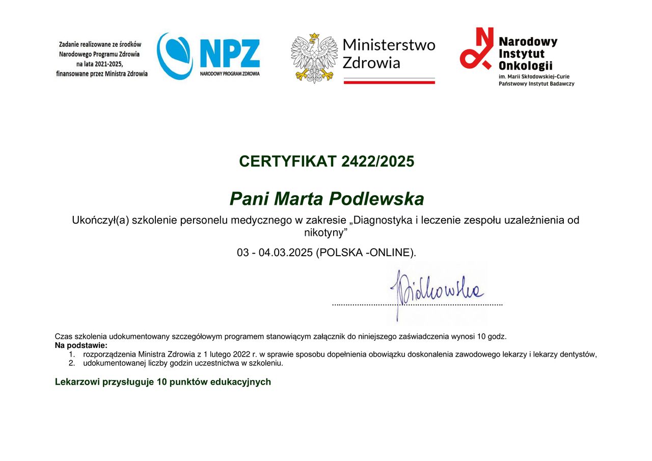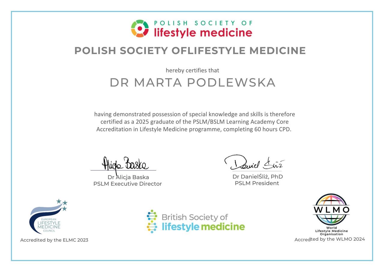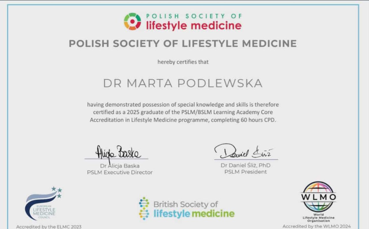 Informujemy, że dr Marta Podlewska uzyskała międzynarodowy certyfikat Lifestyle Medicine Core Accreditation, potwierdzający jej kompetencje w zakresie medycyny stylu życia.