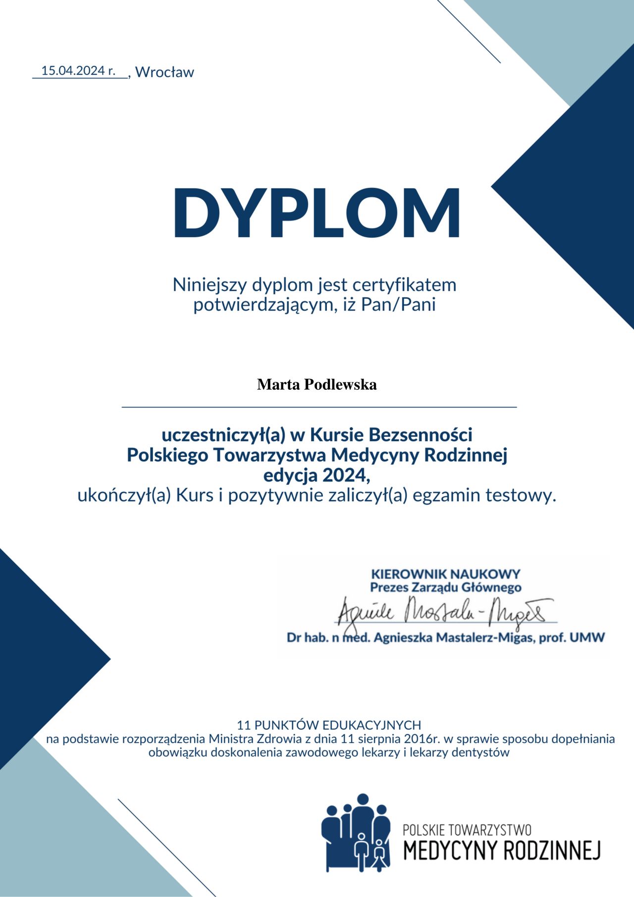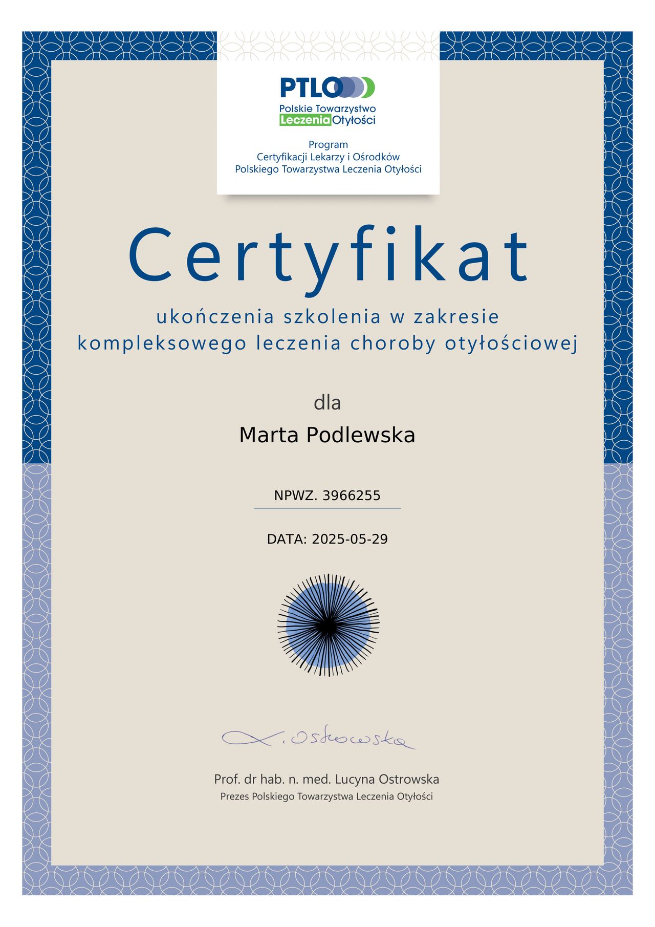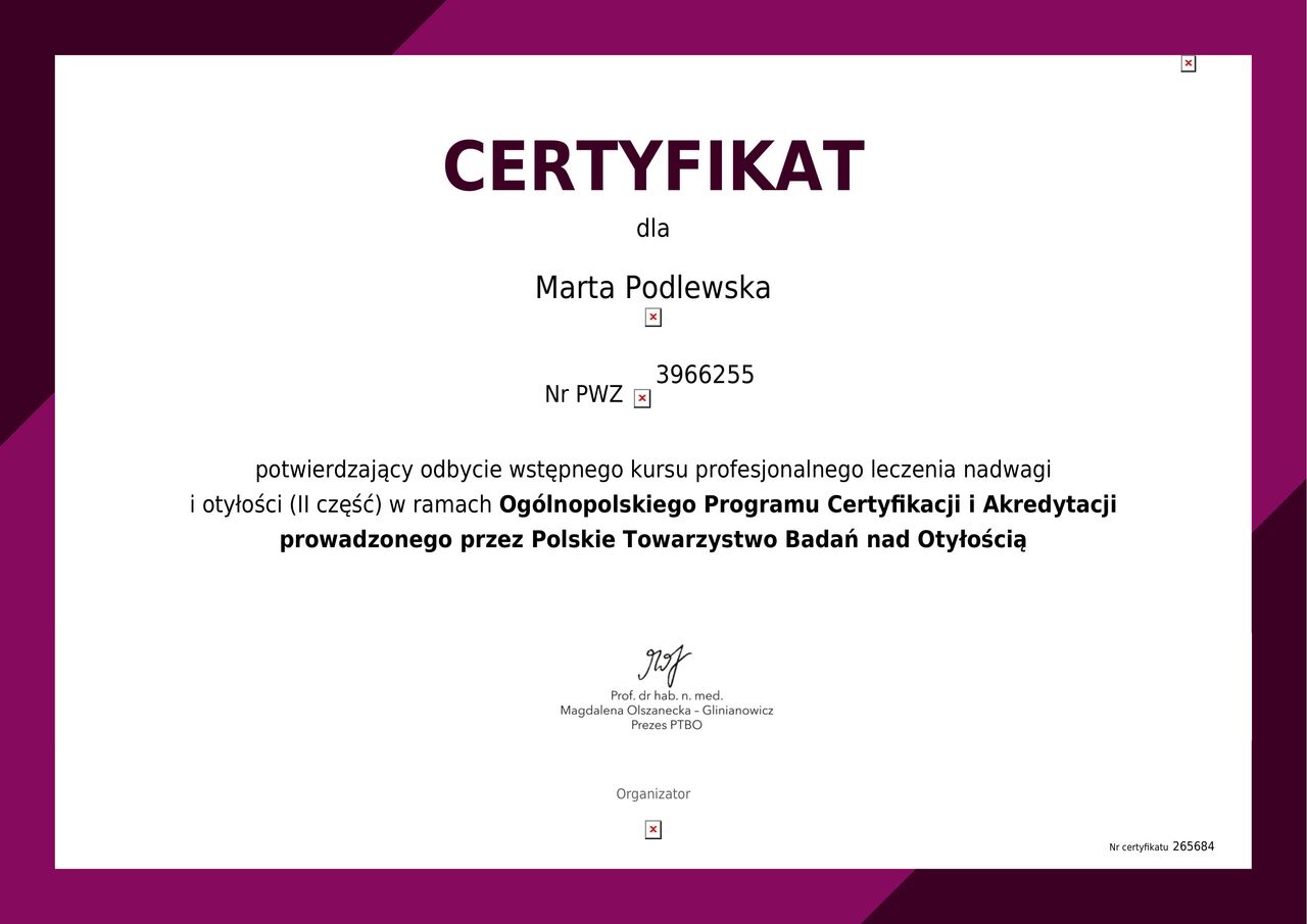 Informujemy, że dr Marta Podlewska uzyskała międzynarodowy certyfikat Lifestyle Medicine Core Accreditation, potwierdzający jej kompetencje w zakresie medycyny stylu życia.