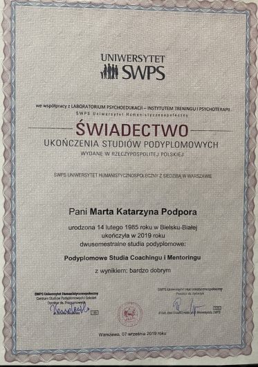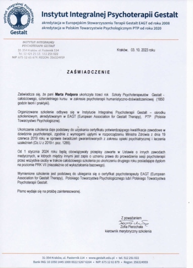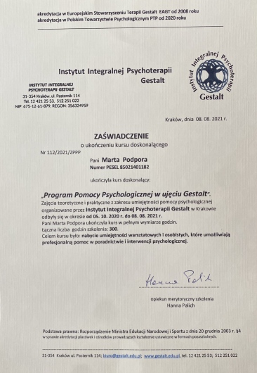 Jestem psychoterapeutką w trakcie 4 - letniego całościowego szkolenia w Instytucie Integralnej Psychoterapii Gestalt w Krakowie, posiadającego akredytację Polskiego Towarzystwa Psychologicznego i EAGT, które obecnie kończę. Ukończyłam także Podyplomowe Studium Coachingu i Mentoringu realizowane przez Szkołę Wyższą Psychologii Społecznej i Laboratorium Psychoedukacji w Warszawie.