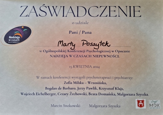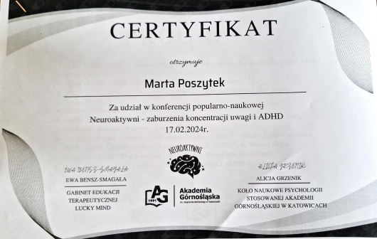 Jaki jest zakres porad oferowanych przez Marta Poszytek?Marta Poszytek to psycholog. Na podstawie swojego doświadczenia i wykształcenia Marta Poszytek oferuje usługi takie jak: Konsultacja psychologiczna, coaching, konsultacja psychologa terapia psychologiczna, psychoedukacja, warsztaty psychologiczne, Konsultacja psychologiczna online, psychoterapia indywidualna, psychoterapia indywidualna online, Psychoterapia dzieci i młodzieży, psychoterapia partnerska.