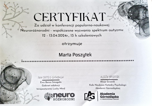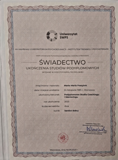 Jestem psychologiem - ukończyłam psychologię kliniczną oraz sądowo-penitencjarną. Coachem i mentorem - ukończyłam podyplomowe studia z coachingu i mentoringu na Uniwersytecie SWPS we współpracy z Laboratorium Psychoedukacji. Przez lata prowadziłam także własną działalność gospodarczą - wspierałam firmy i stowarzyszenia w zakresie księgowości, finansów i kadr. Obecnie jestem w trakcie 4-letniego szkolenia z psychoterapii poznawczo-behawioralnej. Podlegam superwizji i cały czas się doszkalam m.in.w tematyce: neuroróżnorodności, neuroatypowości, wsparcia rodzin. W pracy z klientami łączę wiedzę psychologiczną z umiejętnościami w zakresie coachingu. Cenię sobie możliwość bycia blisko ludzi, jestem otwarta, uważna i tolerancyjna. Moja zdolność do aktywnego słuchania i dzielenia się energią sprawia, że klienci nie tylko cenią moje kompetencje profesjonalne, ale także osobiste zaangażowanie i umiejętność budowania trwałych relacji.