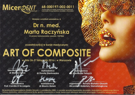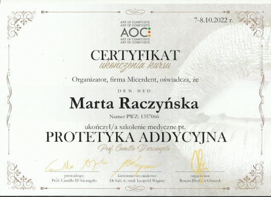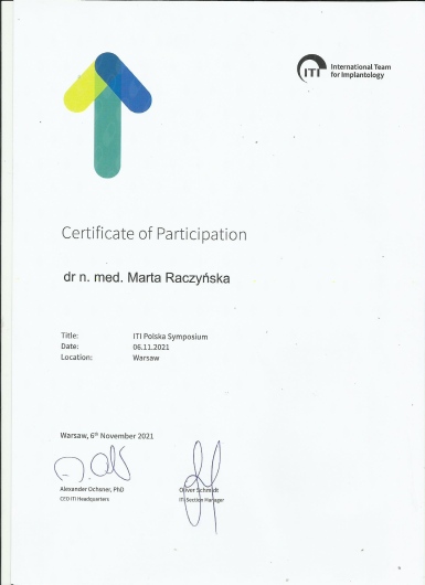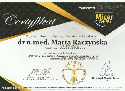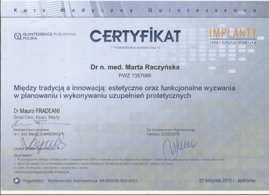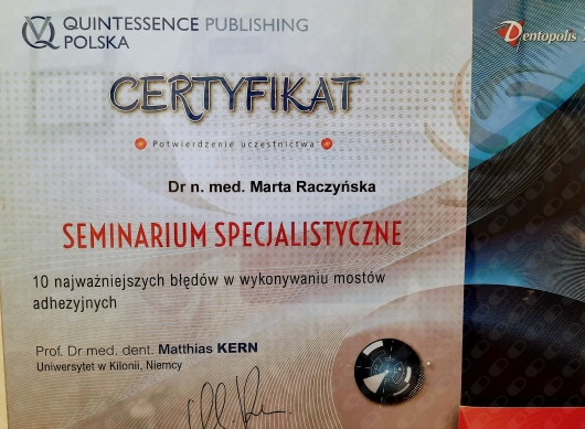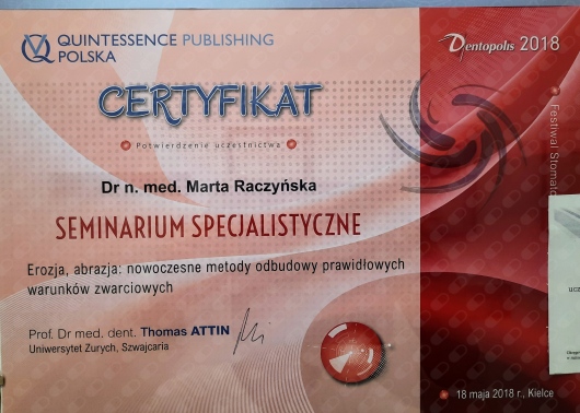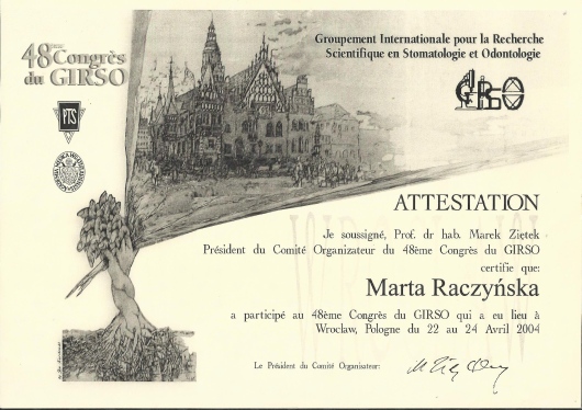 2004r- obrona pracy doktorskiej z dziedziny Stomatologii Minimalnie Inwazyjnej i uzyskanie tytułu naukowego doktora nauk medycznych.