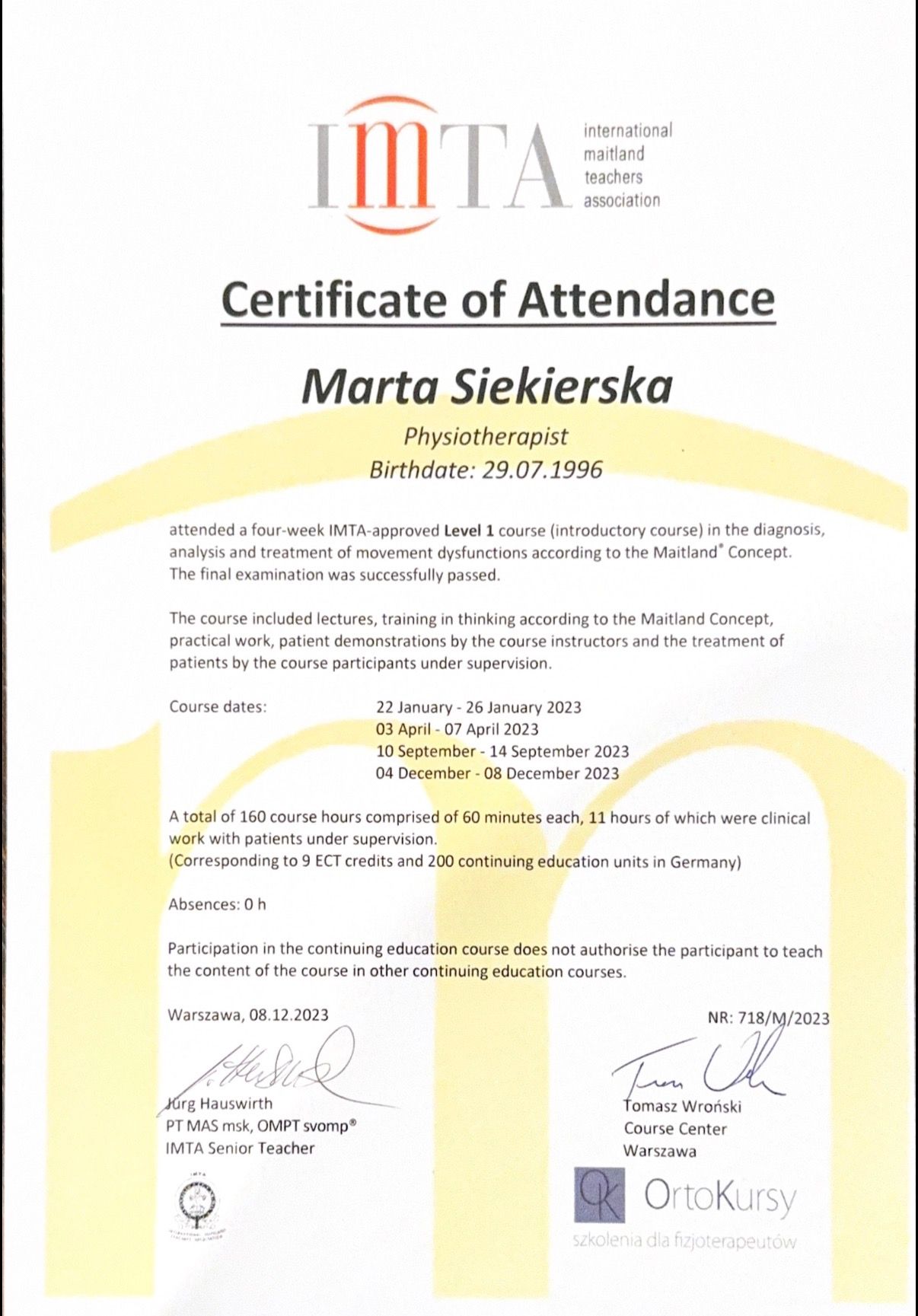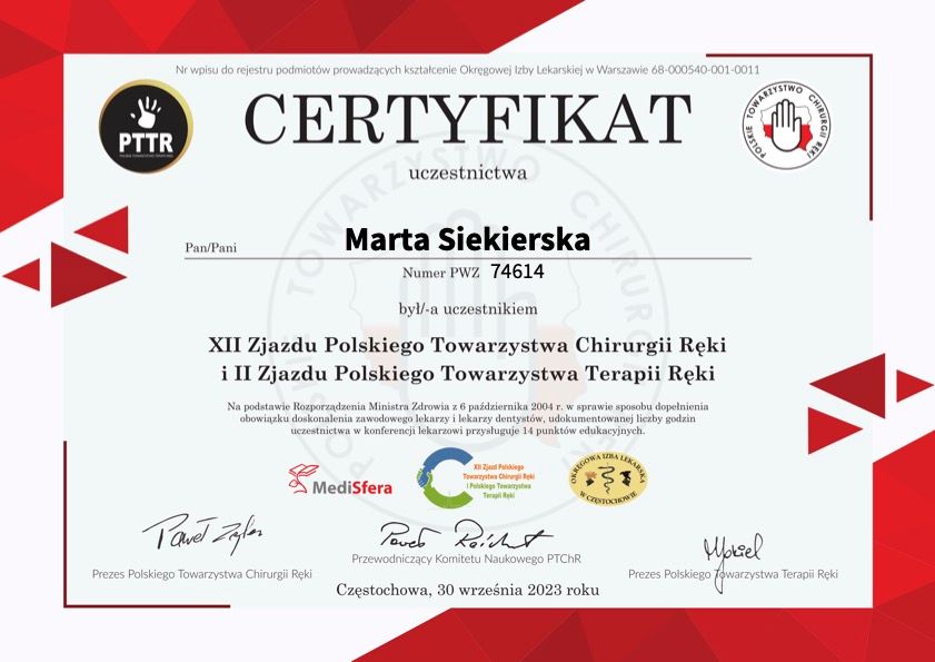 Aktualnie jestem kandydatką do egzaminu Certified Hand Therapist (CHT) (Exam Candidate • maj 2026) i nieustannie poszerzam swoją wiedzę poprzez badania naukowe, międzynarodowe kursy oraz ścisłą współpracę z chirurgami i zespołami interdyscyplinarnymi.