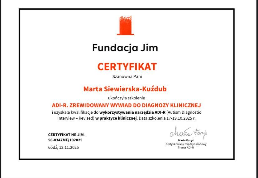 psycholog o specjalności kliniczno-sądowej, psycholog diagnosta - zaburzenia nastroju, zaburzenia osobowości, ADHD i Autyzm u osób dorosłych, terapeuta TSR, instruktor terapii uzależnień