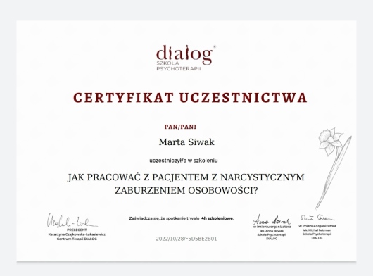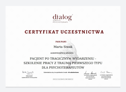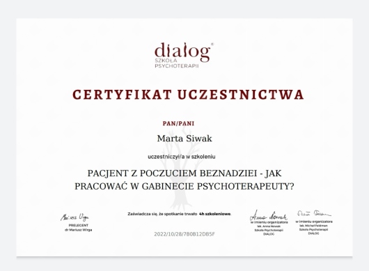 Terapia u pani Marty była dla mnie bardzo ważnym etapem i wsparciem w zdrowieniu. Pracowałyśmy ze soba około 3 lat i właśnie skończyłyśmy :) Trafiłam do niej w trudnym momencie życia, a dzięki jej wsparciu stopniowo udało mi się stanąć na nogi i poukładać wiele spraw.