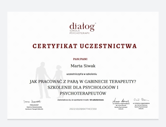 Pani Marta nie tylko uważnie słucha, ale też potrafi trafnie doradzić i pomóc spojrzeć na trudne sytuacje z innej perspektywy. Wspólnie analizujemy różne kwestie, a ja za każdym razem wychodzę ze spotkania z większym spokojem i poczuciem zrozumienia.