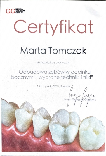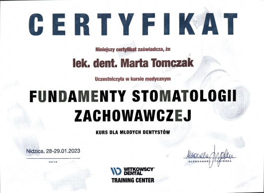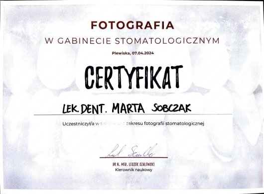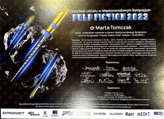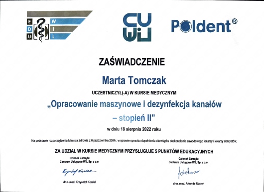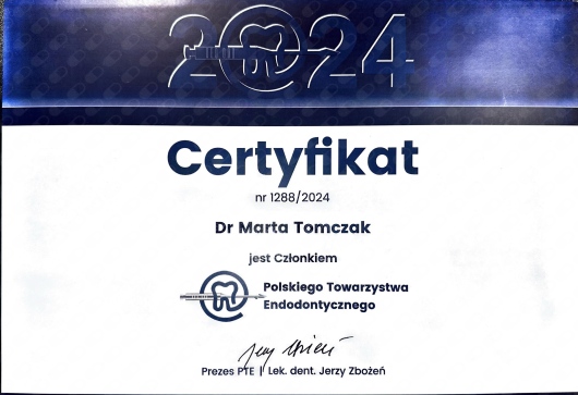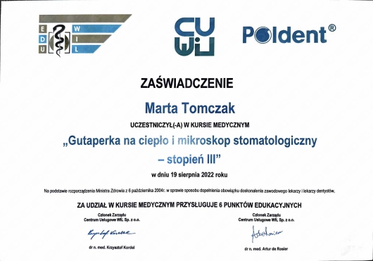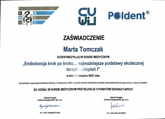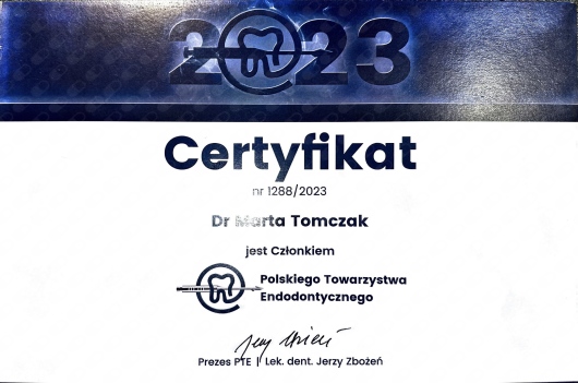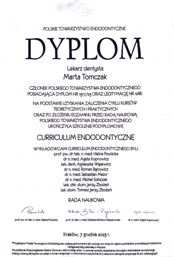 Należę do Polskiego Towarzsytwa Endodontycznego (PTE) oraz European Society of Endodontology (ESE), ukończyłam Curriculum Endodontyczne PTE oraz wiele innych szkoleń z dziedziny endodoncji, chirurgii stomatologicznej oraz stomatologii zachowawczej.