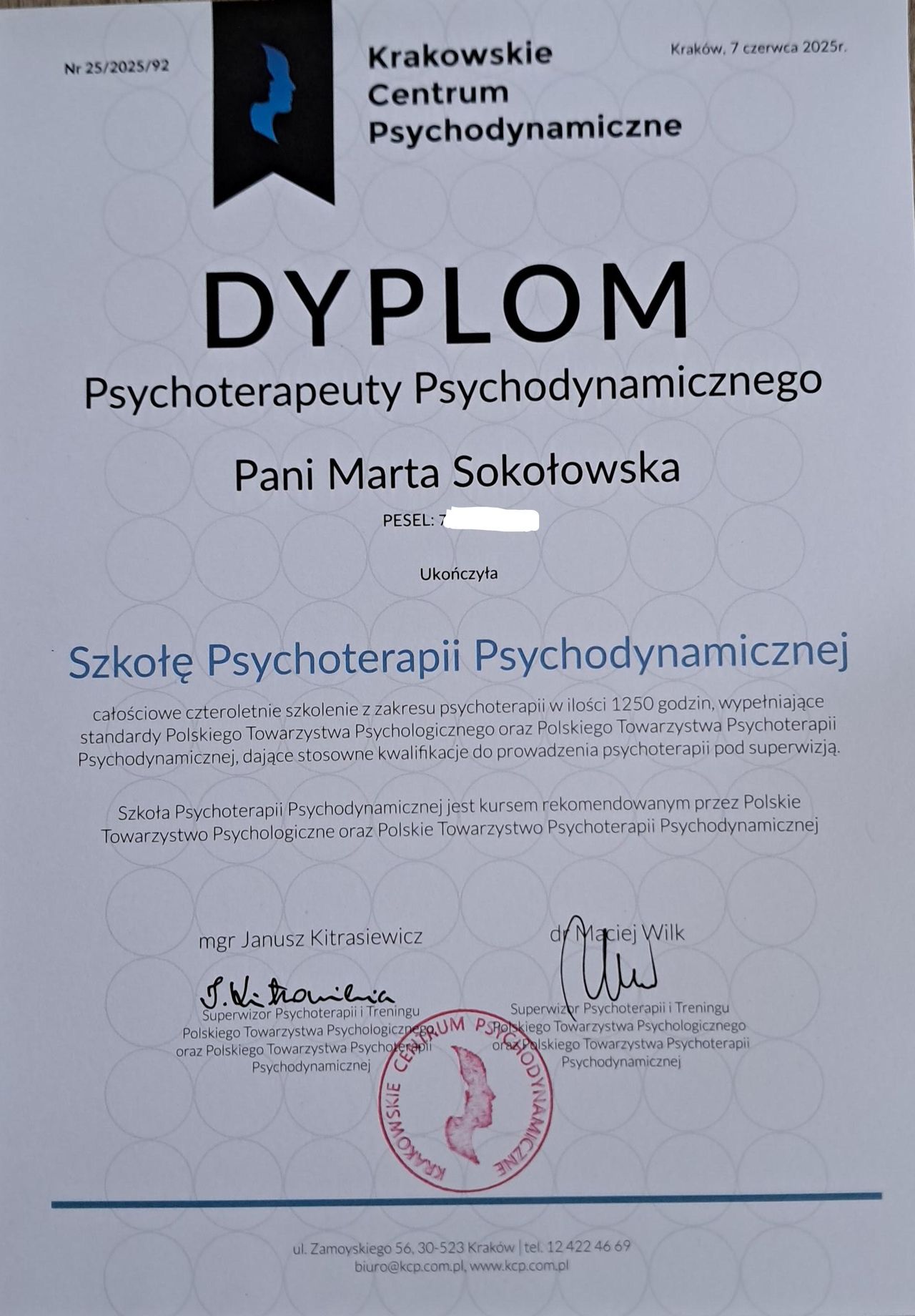 Jestem psychoterapeuką. Ukończyłam całościowy 4-letni Kurs Psychoterapii Psychodynamicznej organizowany przez Krakowskie Centrum Psychodynamiczne w Krakowie. Ośrodek ten jest rekomendowany przez Polskie Towarzystwo Psychologiczne oraz Polskie Towarzystwo Psychoterapii Psychodynamicznej. Czteroletni kurs spełnia wymogi proponowanej ustawy o zawodzie psychoterapeuty. W ramach psychoterapii pracuję w podejściu psychodynamicznym z osobami dorosłymi oraz mlodzieżą od 16 r.ż. Doświadczenie kliniczne zdobyłam min. w Szpitalu Klinicznym im. dr. Józefa Babińskiego w Krakowie w Poradni Zdrowia Psychicznego "Medinorm" w Krakowie. W pracy zawodowej korzystam również z doświadczenia zdobytego w obszarze pomocy społecznej, gdzie udzielałam wsparcia osobom i rodzinom w trudnych sytuacjach życiowych, w poprawie ich funkcjonowania w środowisku społecznym. Poddaję się regularnej superwizji. Jestem członkiem Polskiego Towarzystwa Psychoterapii Psychodynamicznej. W swojej pracy kieruję się zasadami etyki zawodu psychoterapeuty psychodynamicnzego.