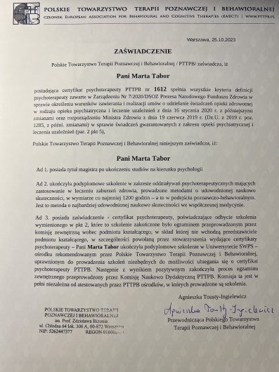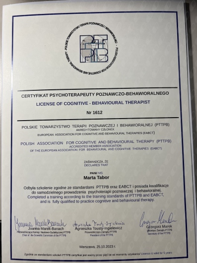 Serdecznie polecam Panią Martę Tabor, bardzo dużo czasu minęło zanim odnalazłam odpowiedniego specjalistę, ale nie żałuje, że tyle czekałam, by trafić na kogoś tak odpowiedniego jak Pani Marta. Poczułam się w 100% zrozumiana i wysłuchana jak nigdy dotychczas. W gabinecie czułam się bardzo komfortowo. Po wielu tygodniach współpracy mogę stwierdzić, że jest doskonałą terapeutką. Dziękuje bardzo!