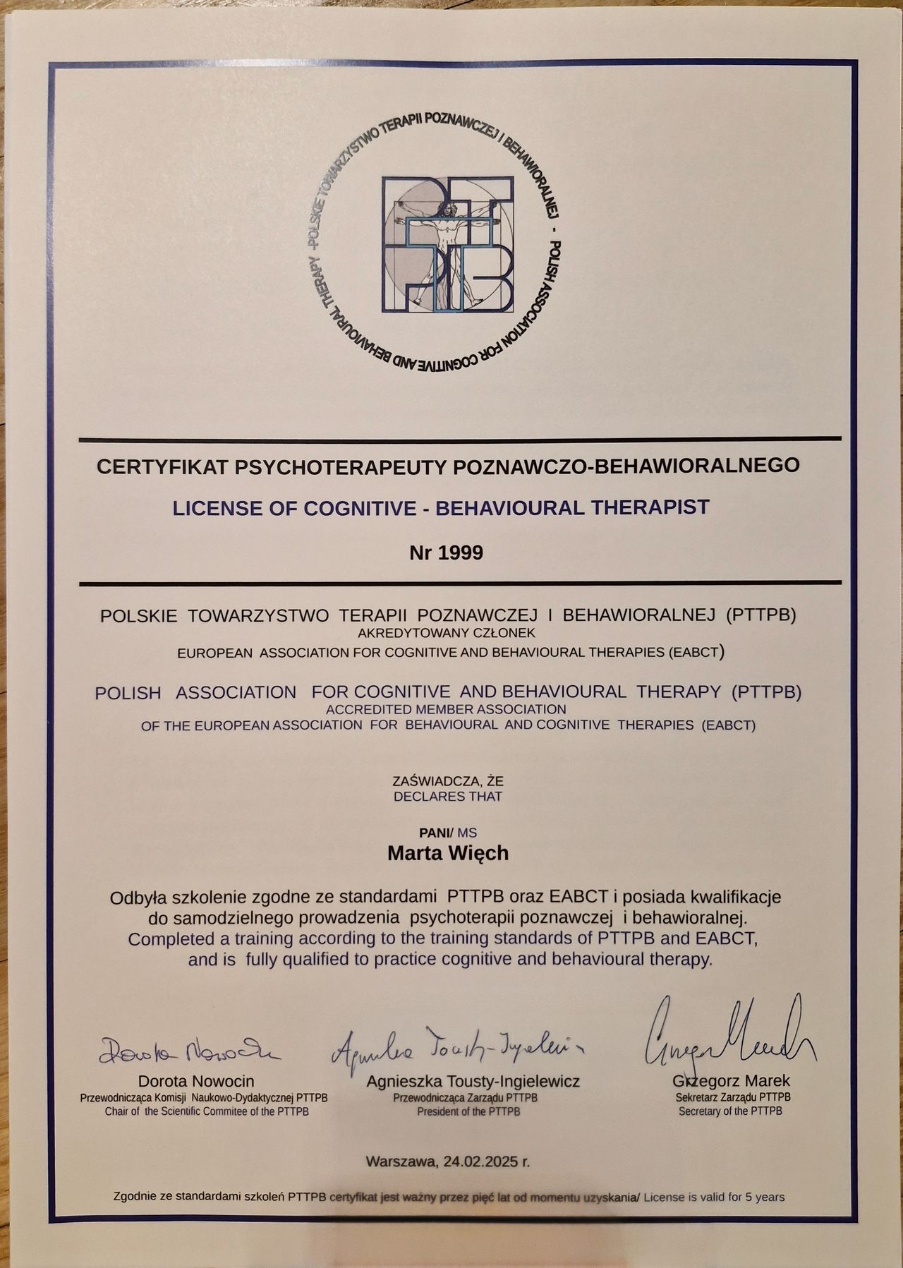 Pani Marta bardzo mi pomogła. Już od pierwszego spotknia wiedziałam, że trafiłam w dobre ręce. Pani Marta jest bardzo empatyczną o wysokiej kulturze osobistej osobą. Cenie ją za profesjonalne podejście i zaangażowanie. Na sesjach czułam się bezpiecznie i komfortowo.