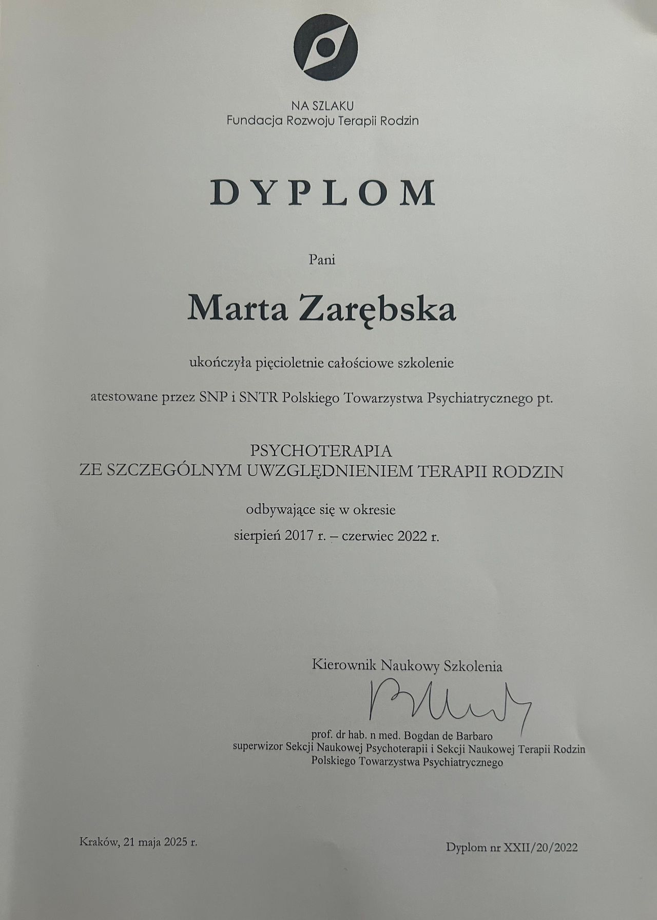 Jestem psychologiem i psychoterapeutą. Ukończyłam pięcioletni kurs psychoterapii przygotowujący do certyfikatu Polskiego Towarzystwa Psychiatrycznego, pod kierownictwem prof. Bogdana de Barbaro.