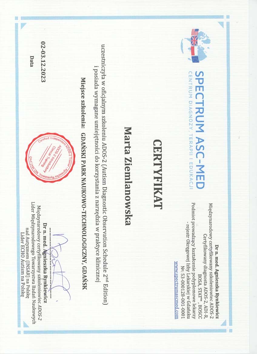 Wykonuję testy: * ADOS-2 - 1000 zł (z drugą osobą posiadającą kwalifikacje), * MOXO - 350 zł, * DIVA-5 - 300 zł, * ASRS - 400 zł, * Conners-3 - 400 zł.