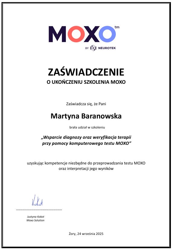 Pani Martyna Baranowska - pierwsza psycholog, która potrafi wysłuchać, nie ocenia, jest niezwykle cierpliwa, nie daje gotowych rozwiązań - pomaga pacjentowi samemu dojść do odpowiednich wniosków. Jej podejście jest holistyczne i indywidualne, co sprawia, że każda sesja jest dostosowana do moich potrzeb. Pani Martyna na każdym spotkaniu daje mi nadzieję na to, że może być lepiej, pomaga poczuć się lepiej. Nasze spotkania dają mi niezwykłego kopa do działania, motywują do pracy nad sobą, dzięki czemu życie nabiera zupełnie innych barw, w końcu tych kolorowych.