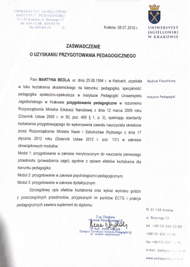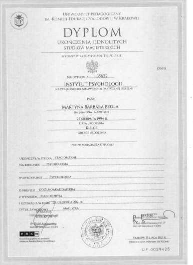 Posiadam doświadczenie w obszarze pracy z osobami w spektrum autyzmu. Obecnie jestem w trakcie 4-letniego szkolenia z psychoterapii w Krakowskim Centrum Psychodynamicznym.