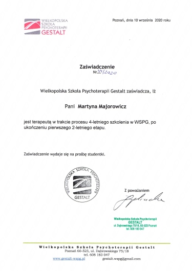 I am a psychologist (UAM Poznan), specialist in the area of psychodietetics (SWPS) and Gestalt psychotherapist during a training process (WSPG).