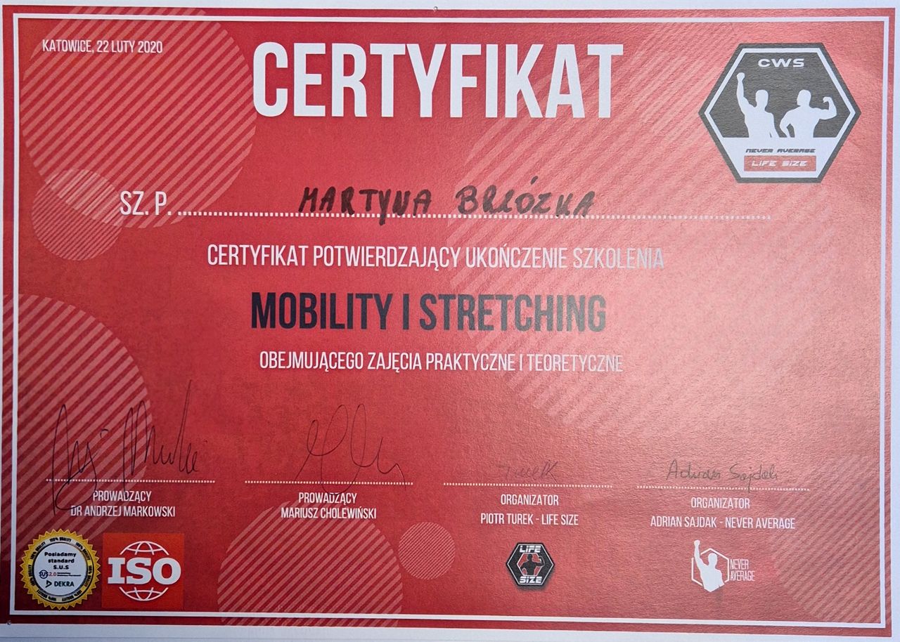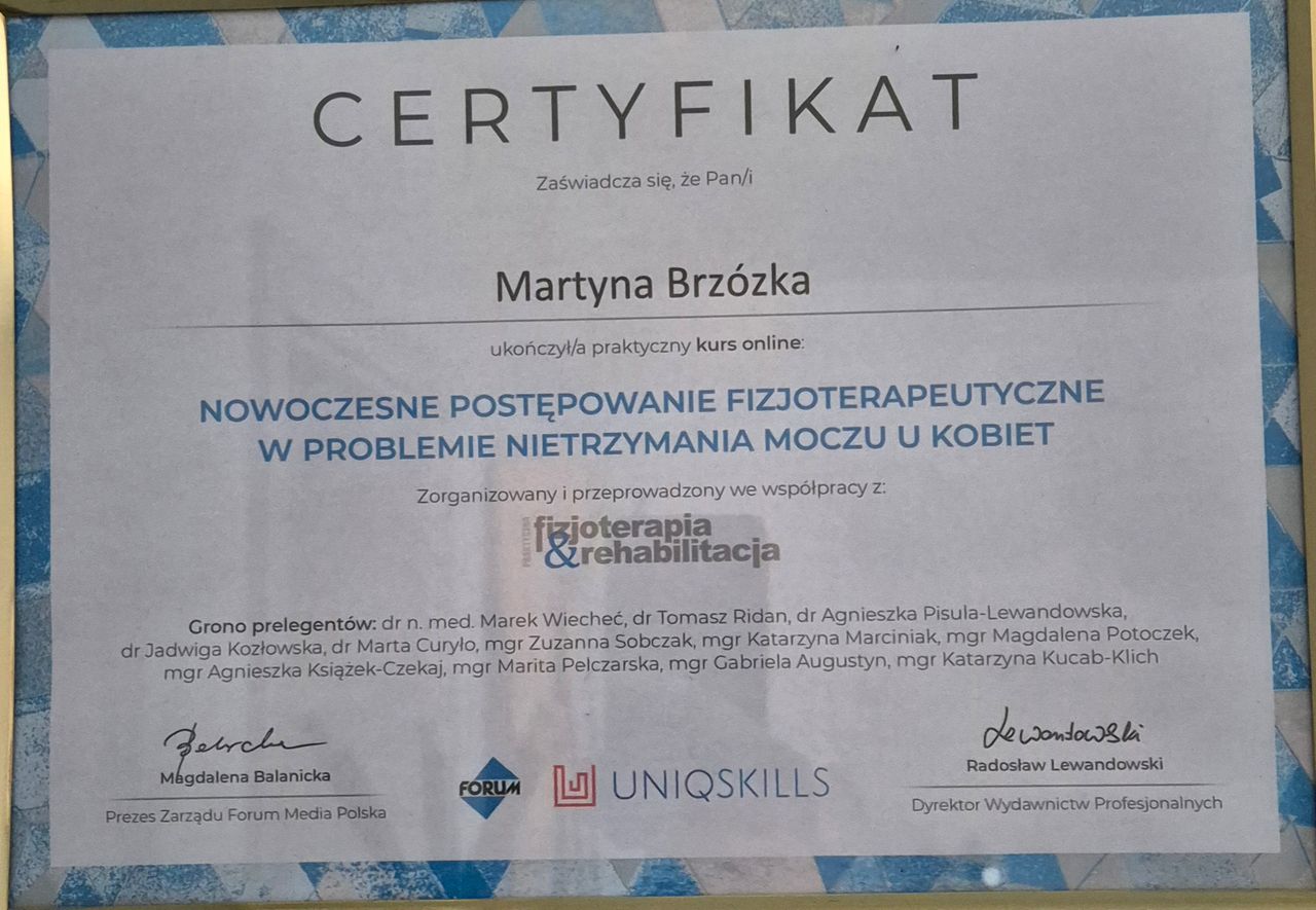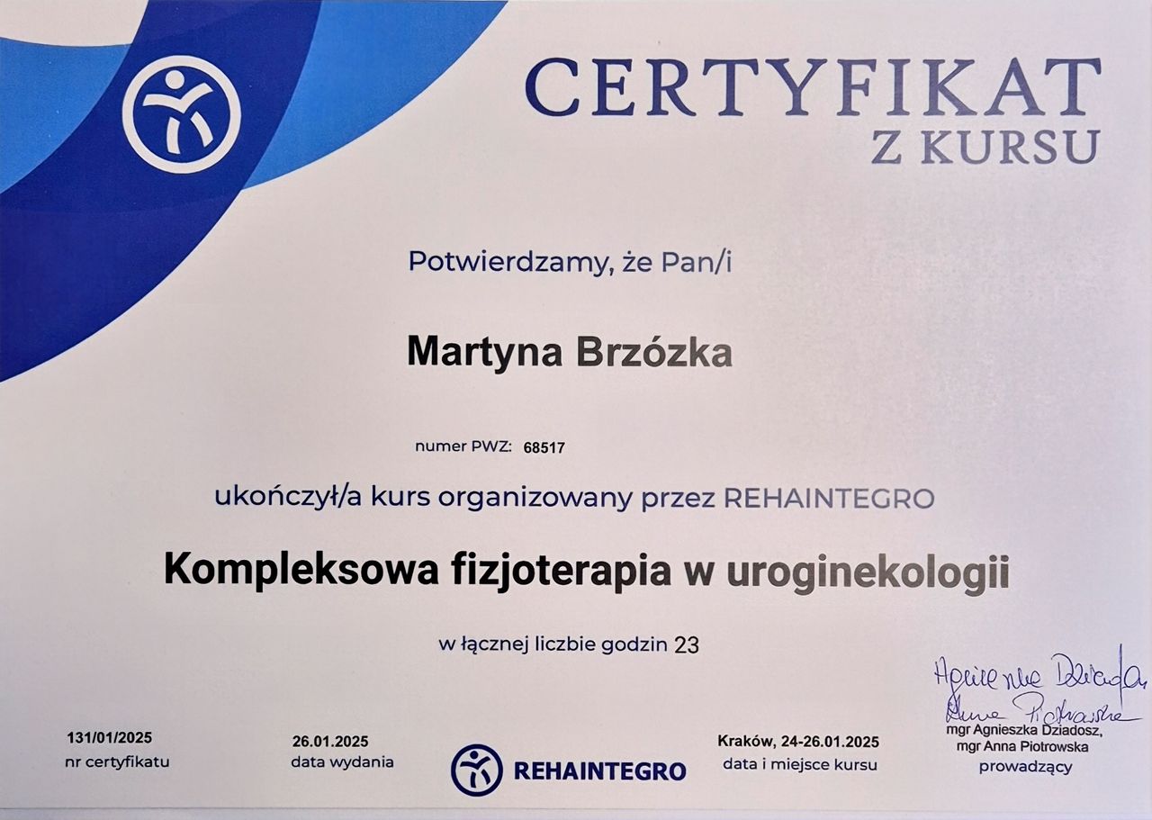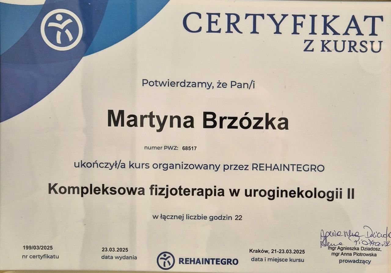 Martyna łączy delikatną terapię manualną z nauką prawidłowego oddechu i ruchu. Pomoże Ci „odczarować” dno miednicy i pokaże, jak odzyskać komfort w codziennych sytuacjach – bez bólu i skrępowania.