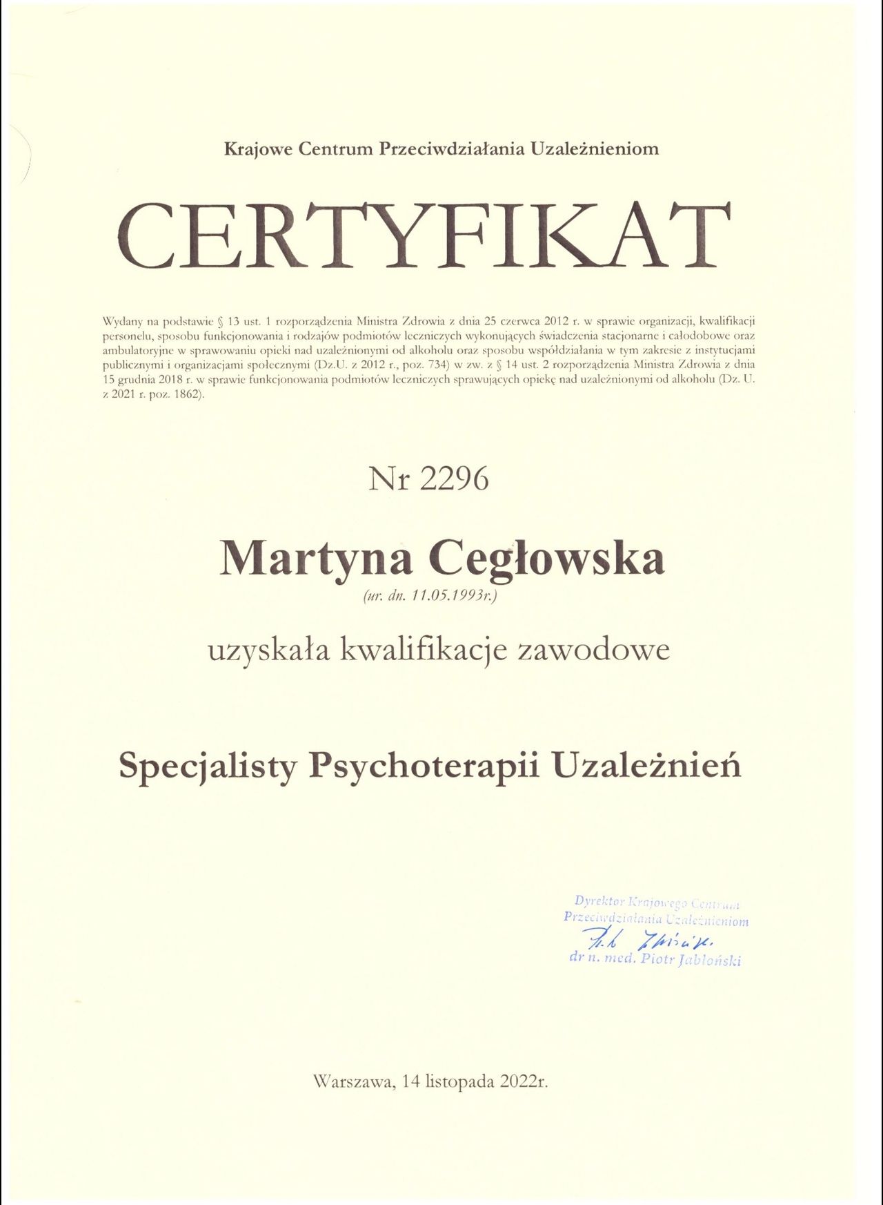 Swoje kwalifikacje w obszarze terapii uzależnień uzyskałam w Fundacji Vis Salutis w Łodzi, kończąc Studium Psychoterapii Uzależnień. Posiadam certyfikat Specjalisty Psychoterapii Uzależnień nadany przez Państwową Agencję Rozwiązywania Problemów Alkoholowych (nr 2296). Aktualnie jestem w trakcie trzyletniej Szkoły Psychoterapii „Ścieżka dla Terapeutów Uzależnień" w Ośrodku Intra, co pozwala mi stale pogłębiać wiedzę i rozwijać kompetencje terapeutyczne.