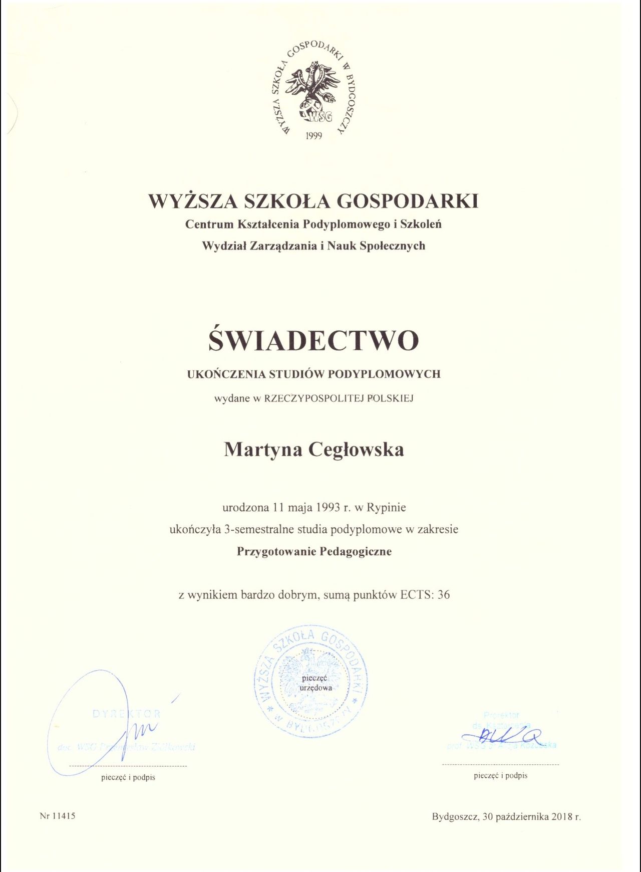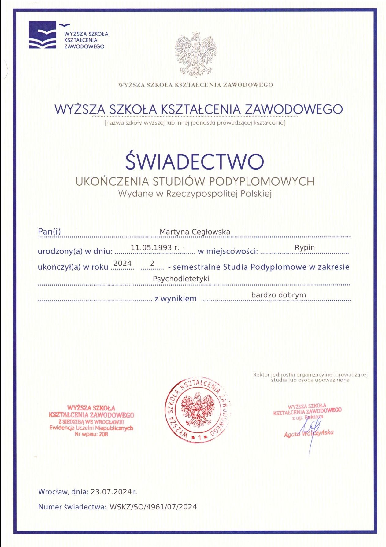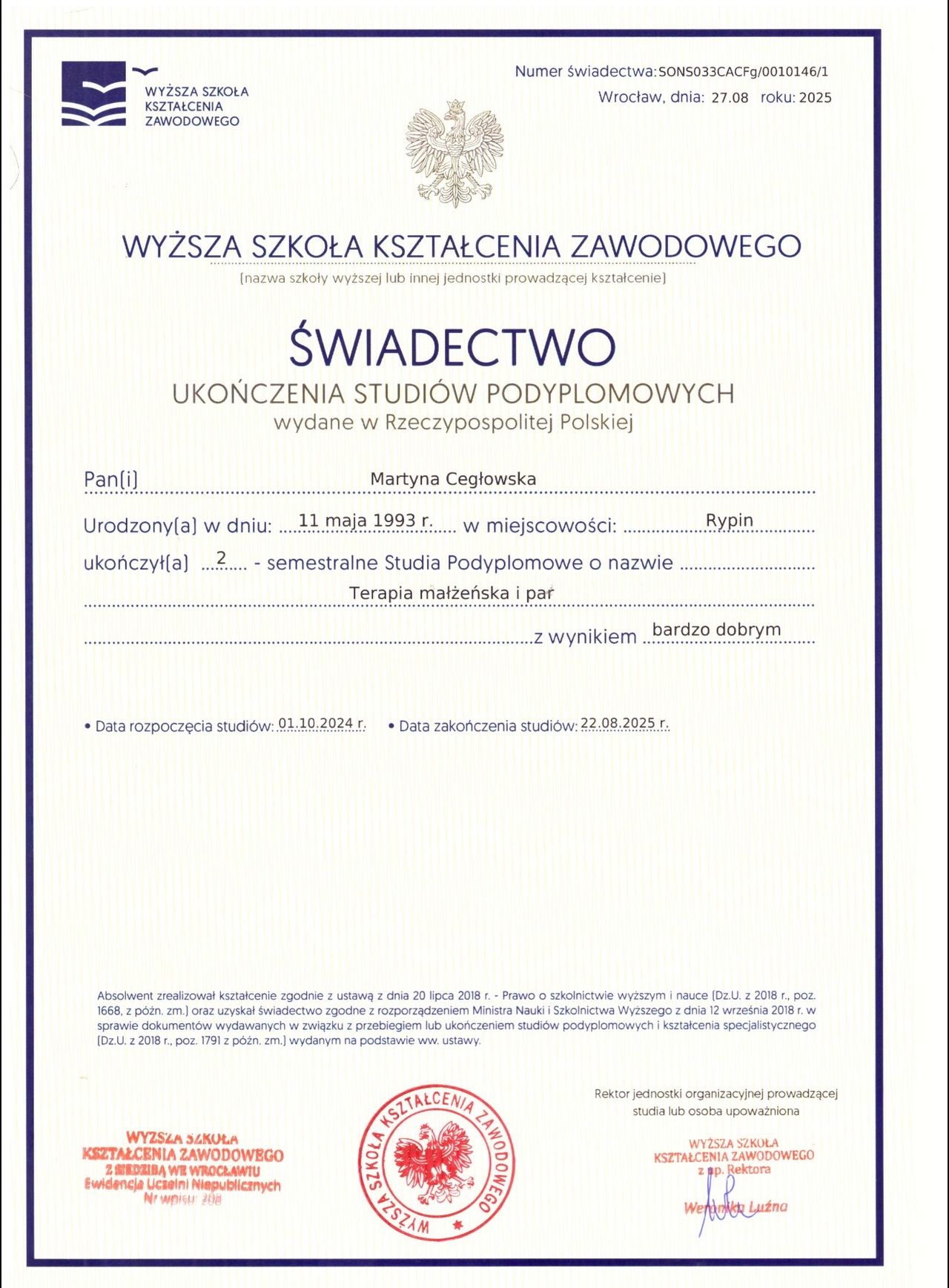 Swoją praktykę zawodową uzupełniłam o studia podyplomowe z zakresu psychologii sportu, psychodietetyki oraz terapii małżeńskiej i par, realizowane w Wyższej Szkole Kształcenia Zawodowego we Wrocławiu. Dzięki temu mogę pracować z osobami o zróżnicowanych potrzebach, uwzględniając zarówno aspekty psychiczne, relacyjne, jak i zdrowotne.