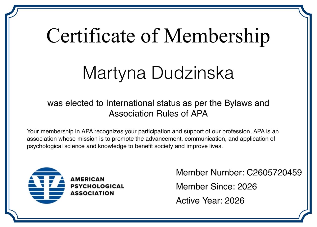 Zobowiązana do ciągłego rozwoju, ukończyłam liczne kursy i szkolenia z psychologii, które pozwoliły mi na rozszerzenie moich umiejętności terapeutycznych i diagnostycznych. Jestem w trakcie specjalizacji na Psychoterapeutę w nurcie poznawczo-behawioralnym. To dodatkowe wykształcenie umożliwia mi pogłębienie wiedzy i umiejętności w zakresie zaawansowanych technik terapeutycznych, co ma kluczowe znaczenie dla skutecznej pomocy moim pacjentom.
