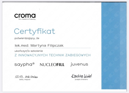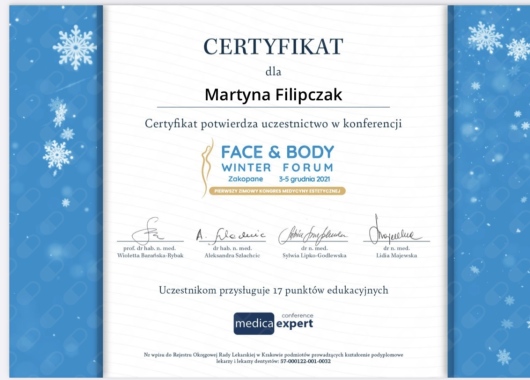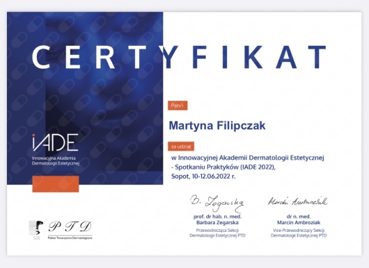 Trafiłam do Pani Doktor z polecenia i jestem zachwycona. Pani Doktor to prawdziwa profesjonalistka, pełna pasji i zaangażowanie. Zna najnowsze trendy w medycynie estetycznej. Podczas każdej wizyty szczegółowo przedstawia przebieg zabiegu, odpowiada na wszystkie pytania i dba o komfort pacjent. Co rzadko spotykane - dba o kontakt również po wizycie. Wielokrotnie pisałam do Pani Doktor po zabiegu i zawsze mogłam liczyć na odpowiedź. Z czystym sercem poleciłam Panią Martynę mamie i przyjaciółce i obie były bardzo zadowolone! Cieszę się, że trafiłam na tak wspaniałą specjalistkę :)
