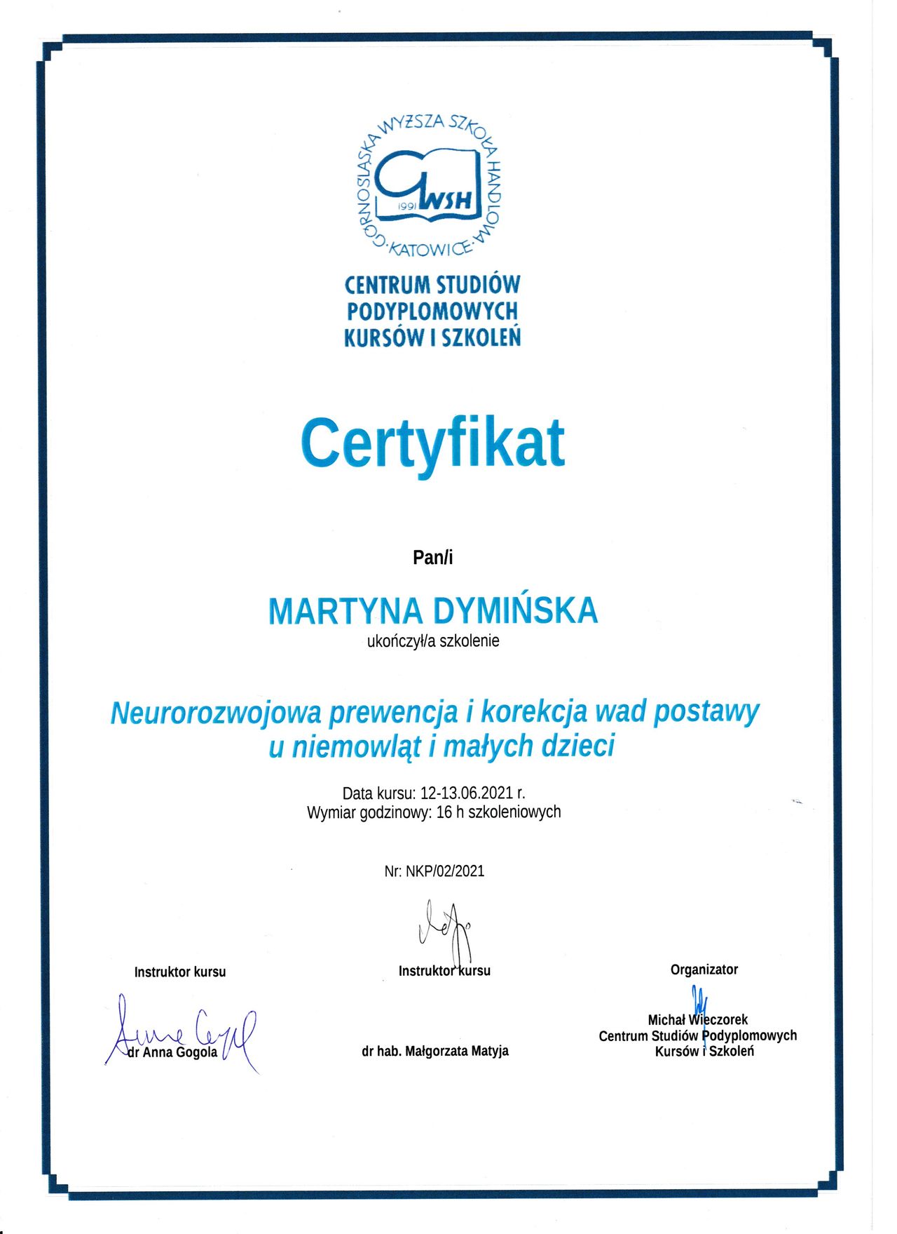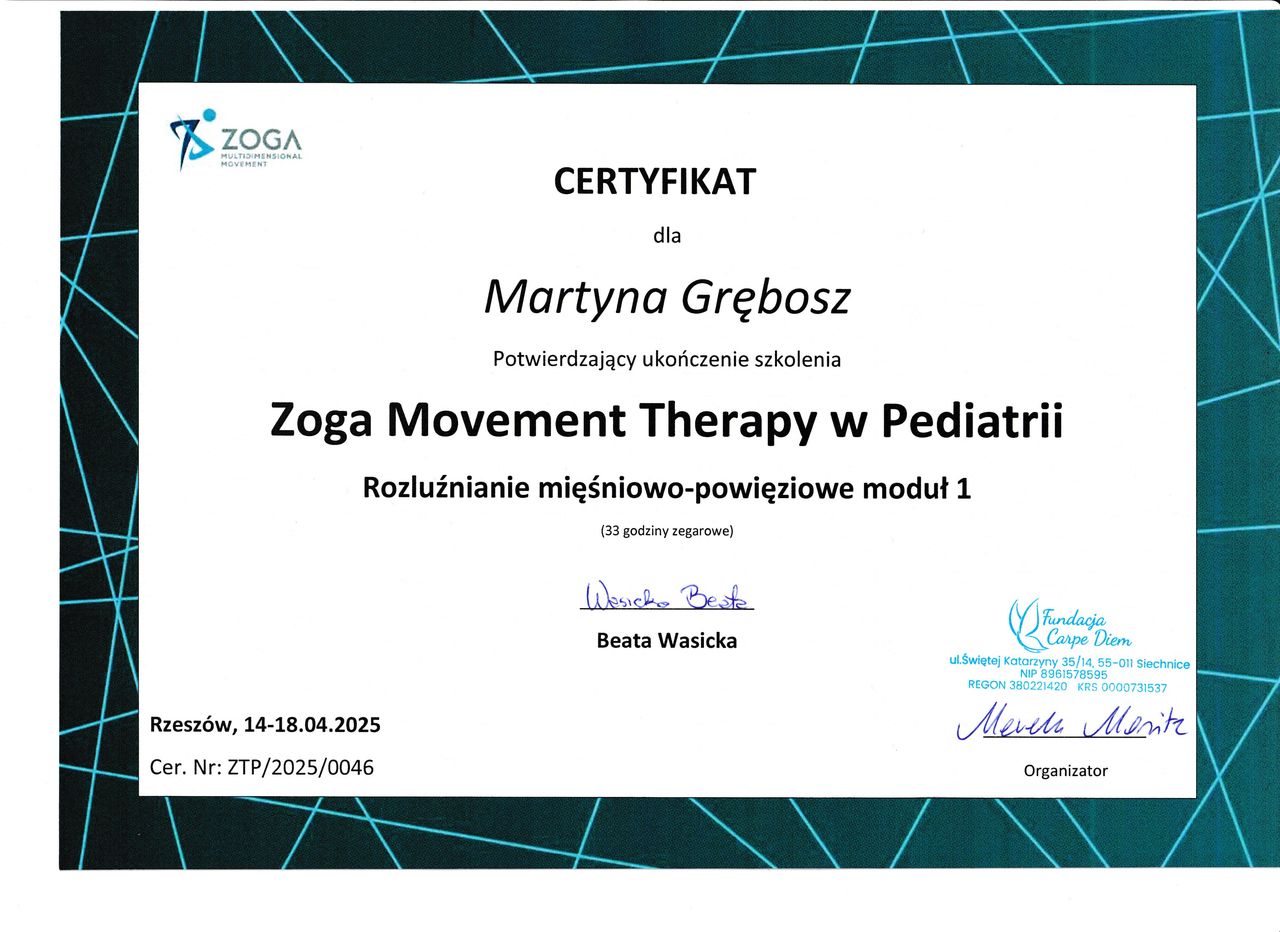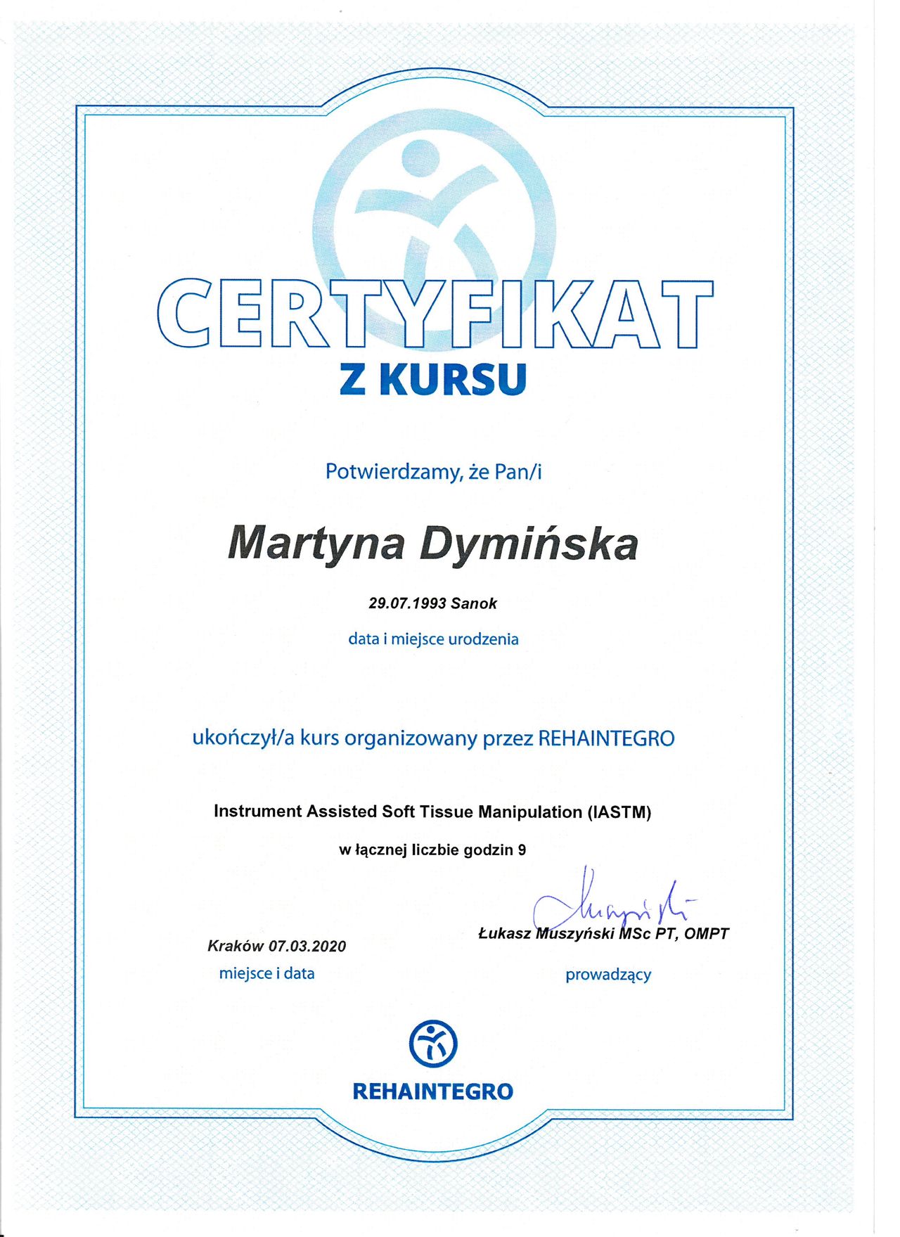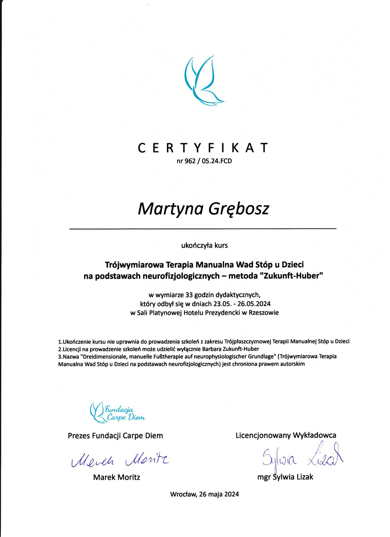 Swoją wiedzę rozwijałam na licznych szkoleniach, m. in. NDT- Bobath, Zoga Movement Therapy, Trójwymiarowej Manualnej Terapii Stóp, terapii neurorozwojowej u dzieci oraz plastrowaniu dynamicznemu.