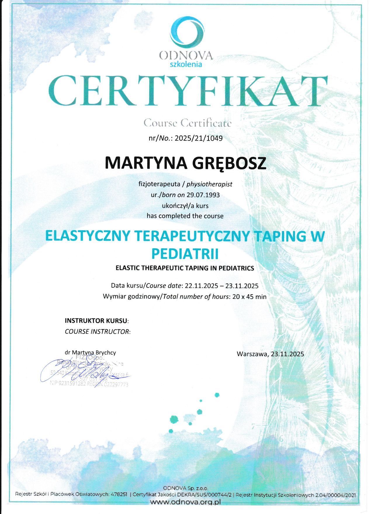 Jaki jest zakres porad oferowanych przez Martyna Grębosz?Martyna Grębosz to fizjoterapeuta, fizjoterapeuta dziecięcy. Na podstawie swojego doświadczenia i wykształcenia Martyna Grębosz oferuje usługi takie jak: konsultacja fizjoterapeutyczna dzieci.