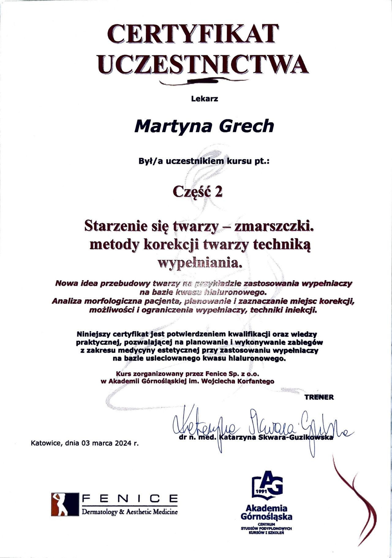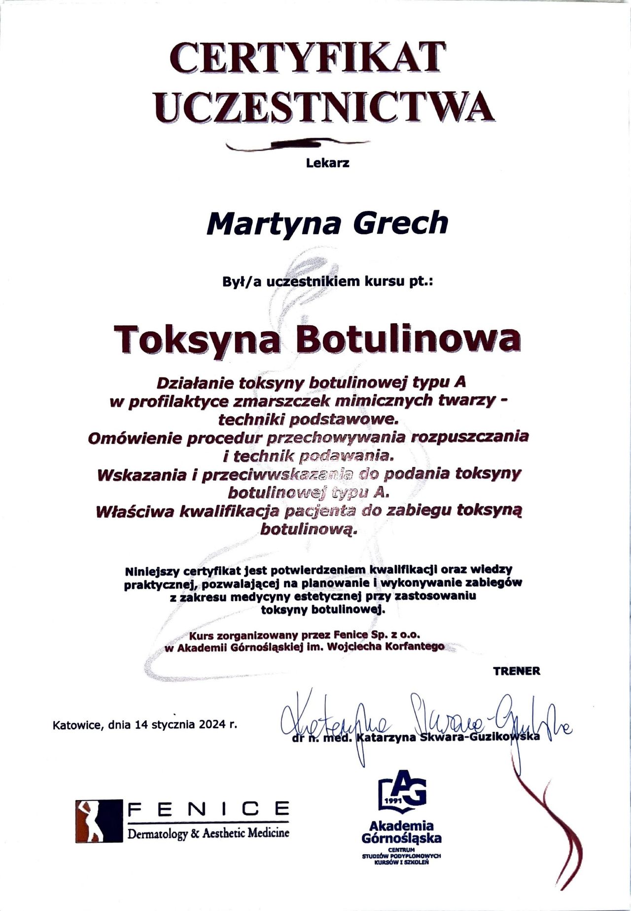 Ukończyłam również studia podyplomowe z zakresu medycyny estetycznej na Akademii Górnośląskiej im. Wojciecha Korfantego w Katowicach. Dzięki temu mogę łączyć podejście holistyczne z troską o zdrowie i naturalne piękno moich pacjentów.