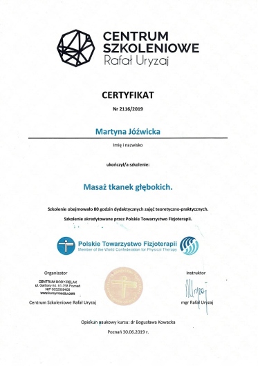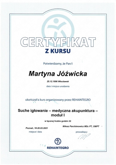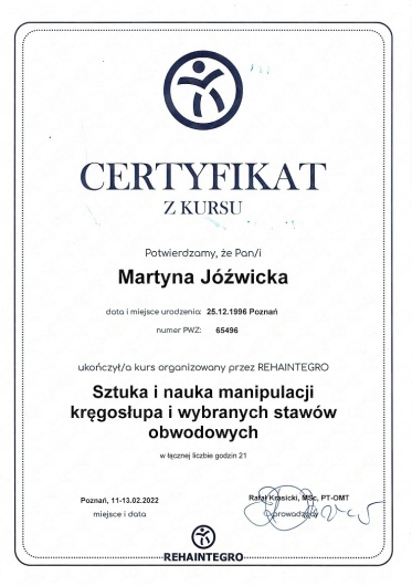 Jaki jest zakres porad oferowanych przez Martyna Jóźwicka?Martyna Jóźwicka to fizjoterapeuta. Na podstawie swojego doświadczenia i wykształcenia Martyna Jóźwicka oferuje usługi takie jak: konsultacja fizjoterapeutyczna, Terapia manualna, rehabilitacja ortopedyczna, fizjoterapia, medyczny trening rehabilitacyjny, Trening motoryczny.
