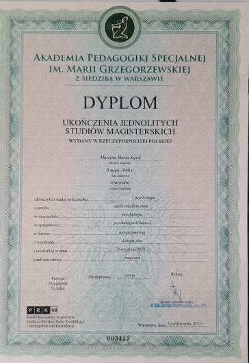 Zazwyczaj nie dzielę się opiniami, ale współpraca z Panią Martyną okazała się dla mnie doświadczeniem, które miało pozytywny wpływ na moje życie.Nie jest to moja pierwsza współpraca z psychologiem, jednakże Pani Martyna wyróżnia się wyjątkową empatią i zaangażowaniem. Pomogła mi lepiej zrozumieć samą siebie, wzmocnić poczucie wartości. Szczerze polecam.